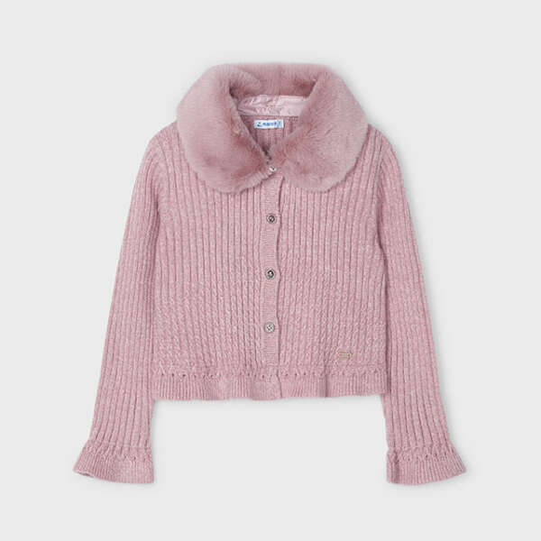 MAYORAL Dievčenský rebrovaný sveter s kožušinovým golierom ružový Cardigan rose 4362 | Welcomebaby.sk