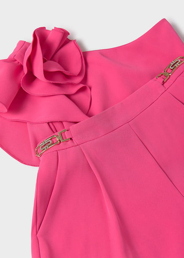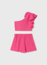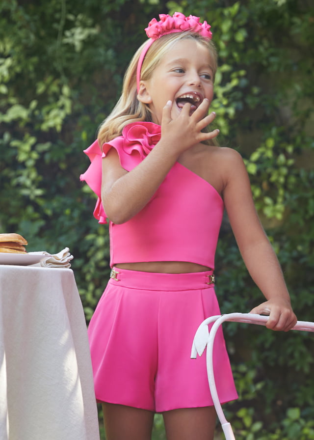 Elegantný kraťasový set v sýtoružovej farbe. Top na jedno ramienko s volánom. Materiál: 100% polyester, podšívka 100% viskóza. Veľkosť na 4 r, 5 r, 7 r, 8 r.