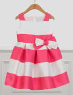 Elegantné pruhované šaty na slávnostné príležitosti. V bielo ružovom farebnom prevedení. Šaty na hrubšie ramienka, so zapínaním na zips a mašľou na páse. Materiál: 100% polyester, podšívka: 85% bavlna, 15% polyester.