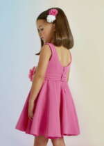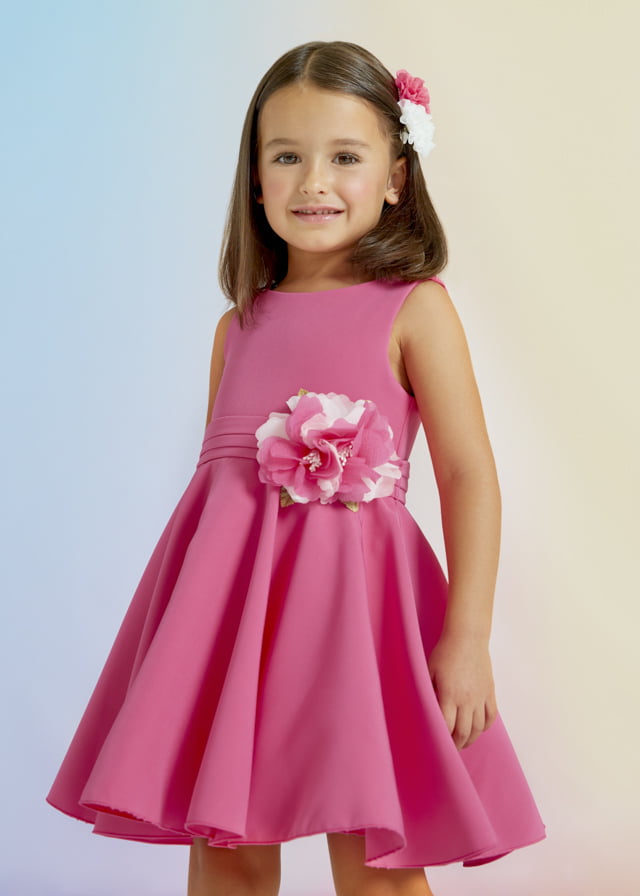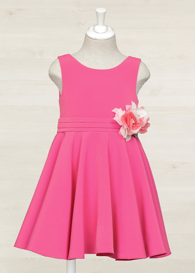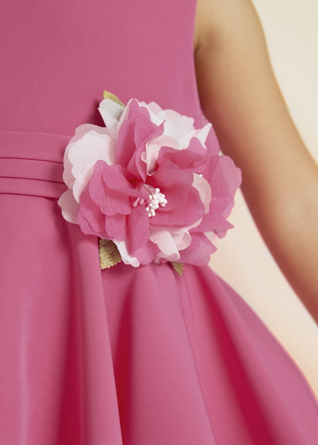 Dress pink. Fuchsia plain dress in crepe for girls. Cotton lining. Cancan tulle to give more volume to the skirt. Sash with floral applique. Back opening with invisible zip.
