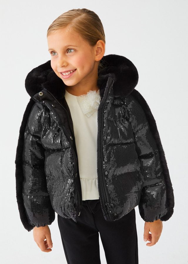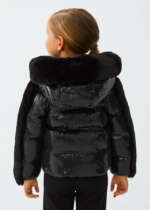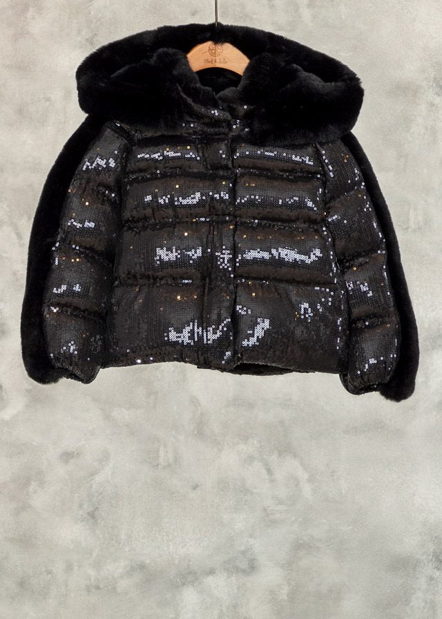 Girl’s short jacket.Fabric: Taffeta with sequins. Detachable faux fur-lined hood. Faux fur trim on sleeves. Functional side pockets with invisible zip. Opening with inner snaps.