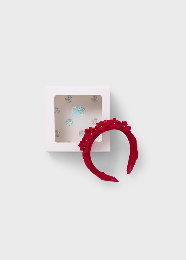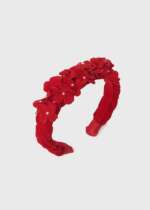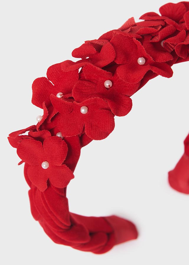 Zamatová zapletaná čelenka s kvetmi v červenej farbe pre dievčatá. Uprostred každého kvetu sa nachádza drobná korálka. Materiál: 100% polyester.