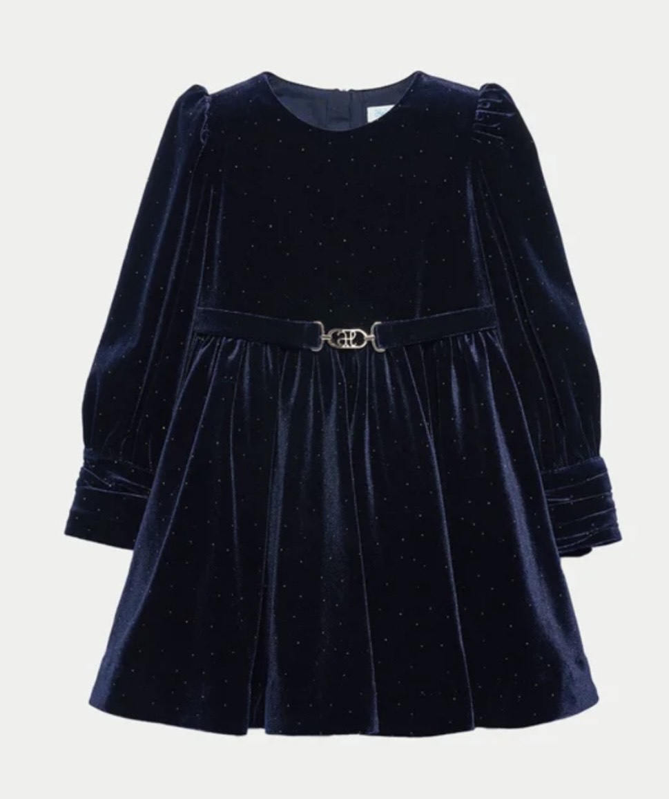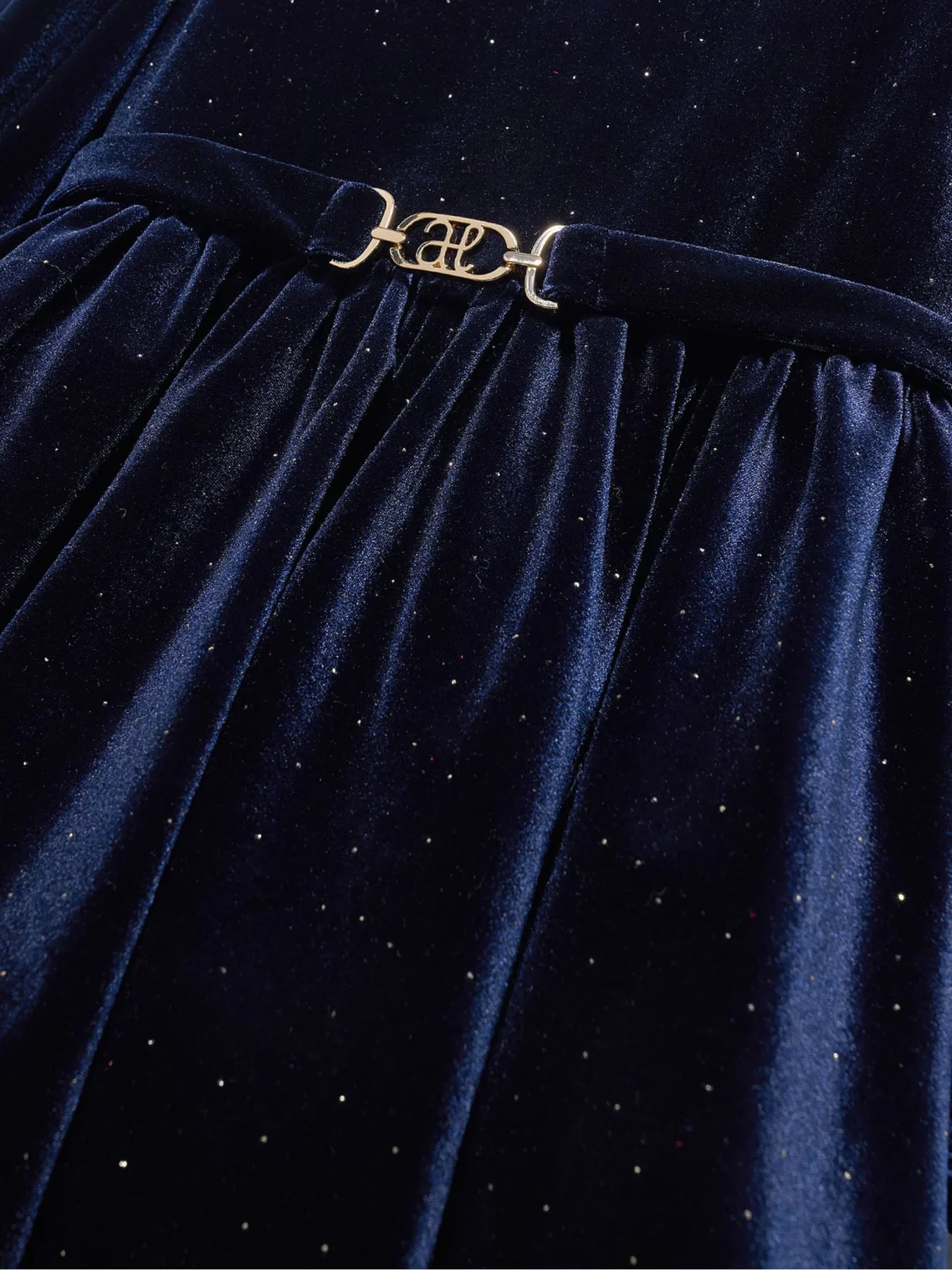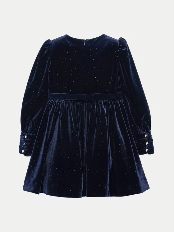 Elegantné zamatové šaty s dlhým rukávom a jemnými zlatými bodkami. Pre väčšiu elegantnosť sú na rukávoch tri zlaté gombíky. Pre väčší objem sukne majú šaty dve podšívky, jednu bavlnené a jednu tylovú. Materiál: vnútro 100% bavlna, zvonka: 97% polyester, 3% elastan.