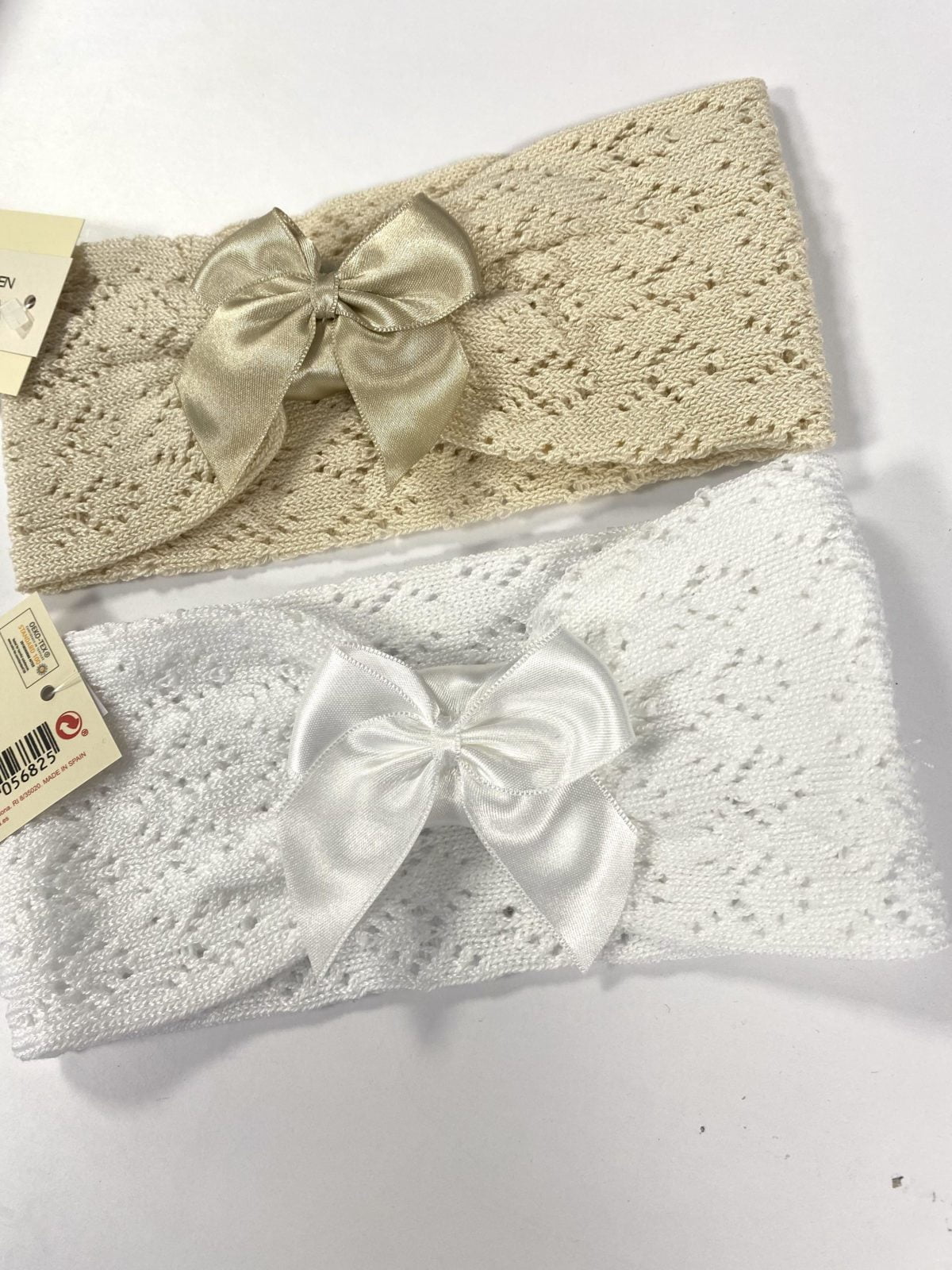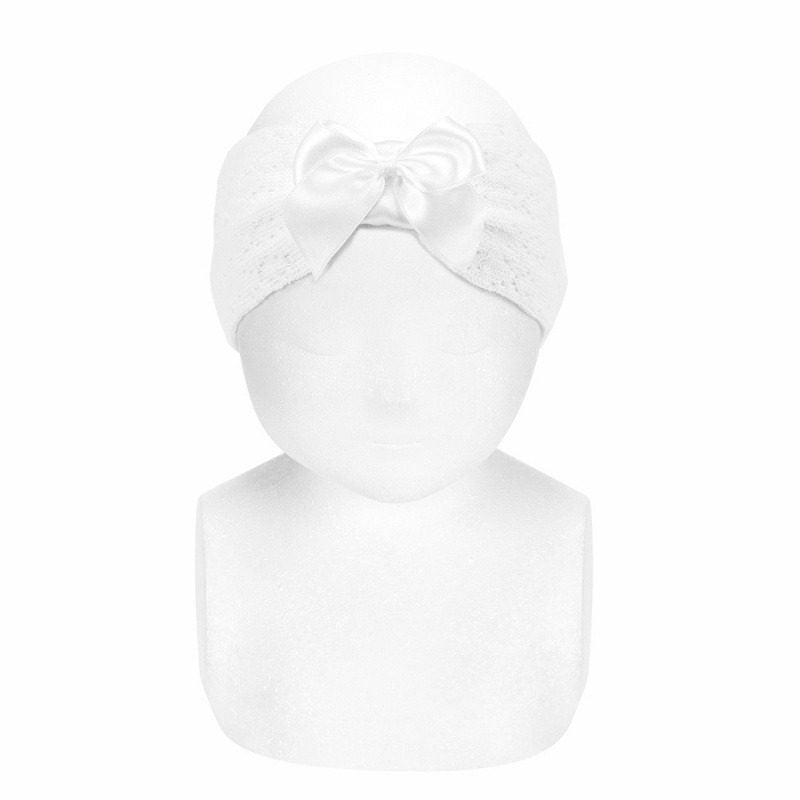 Vzorované dierkovaná baby čelenka so saténovou mašľou Cóndor. Snehovobiela čelenka so vzorom pre bábätká a dievčatká.