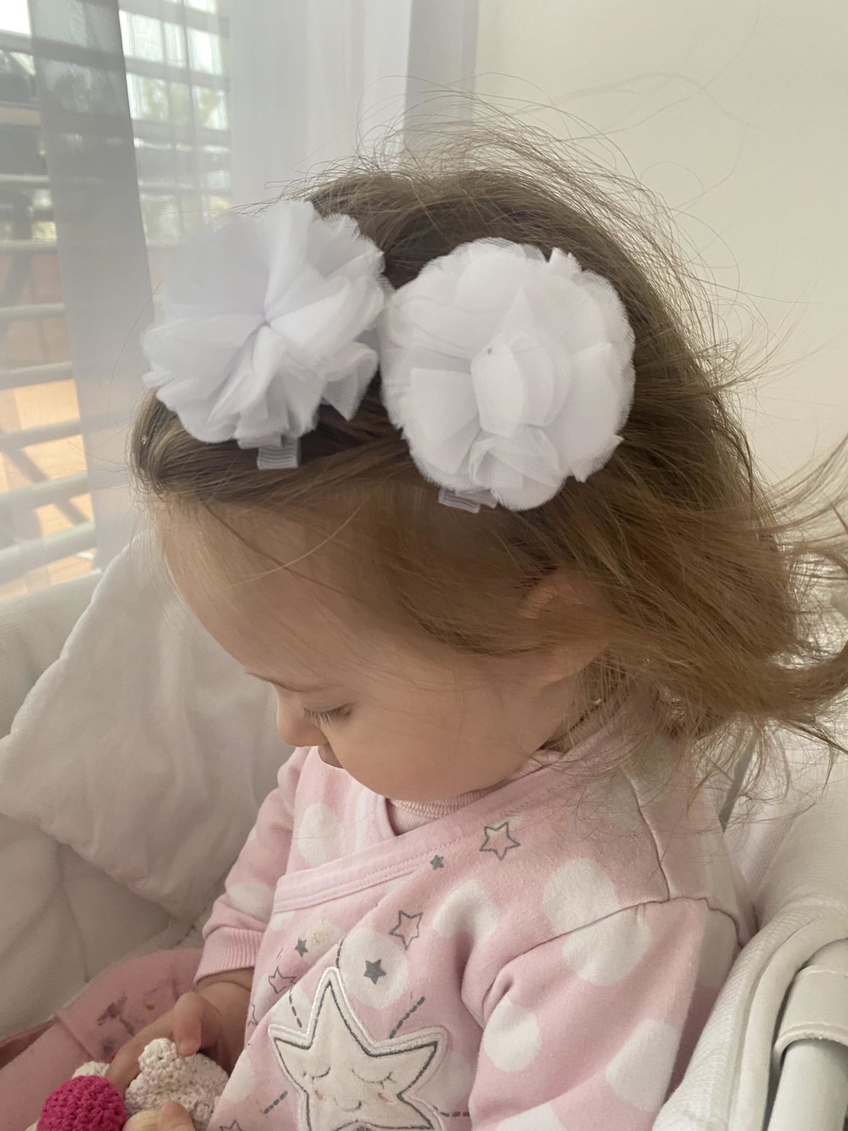 Tylový biely kvet do vlasov. Krásne dokončí outfit dievčatka.