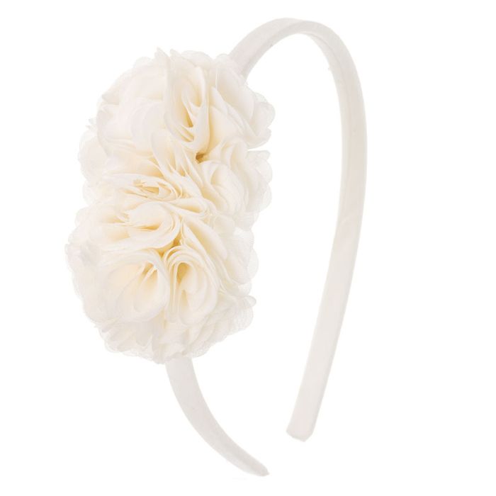 Kvetovaná krémová čelenka. Krásna čelenka s dvomi bombuľkovými kvetmi. Vhodná od 4 rokov na oslavy, ale aj na bežné nosenie.