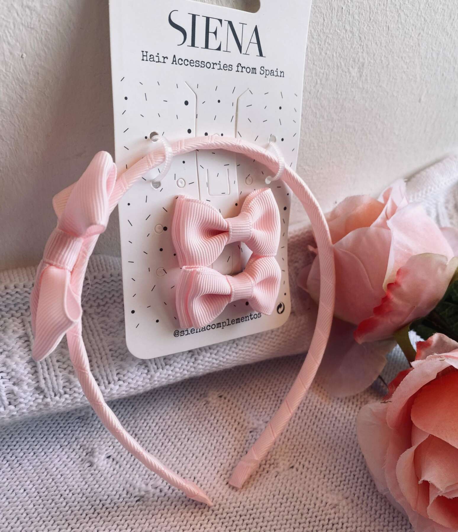 Baby ružová čelenka s mašličkou a dvomi mašličkovými sponkami vyrobené handmade v Španielsku. Ružová pevná čelenka. Touto čelenkou pekne dokončíte outfit dievčatka.