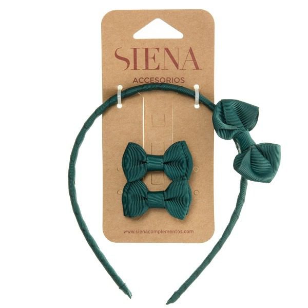 Tmavozelená pevná čelenka s mašličkou a dvomi sponkami značky Siena. Vyrobené handmade v Španielsku. Krásna čelenka do vlasov pre princezné.