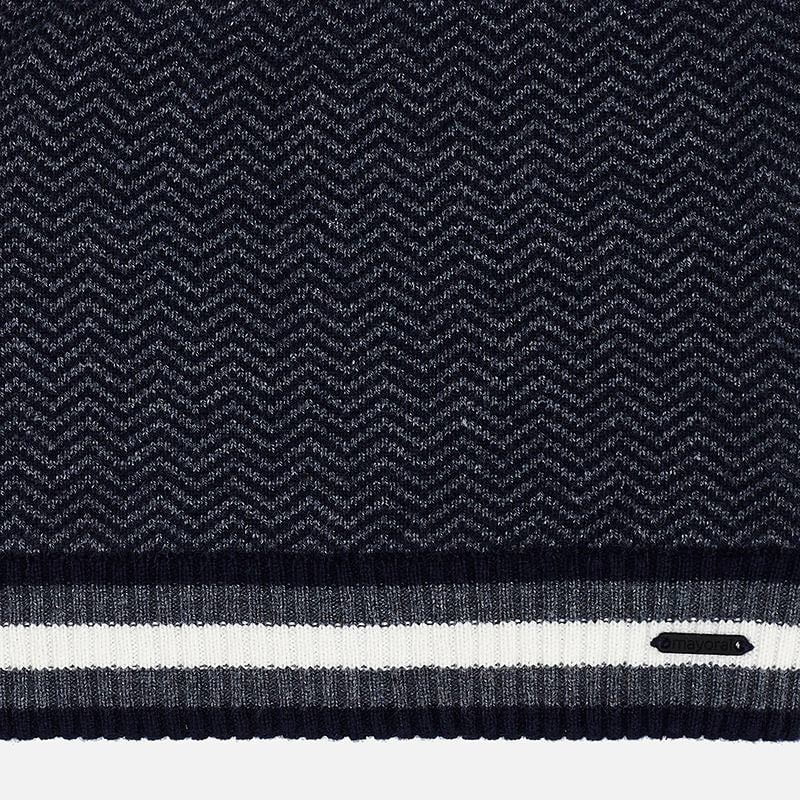 Chlapčenská čiapka s nákčníkom. Farba: tmavomodrá so sivou. Materiál: 60% bavlna, 30% polyamid.