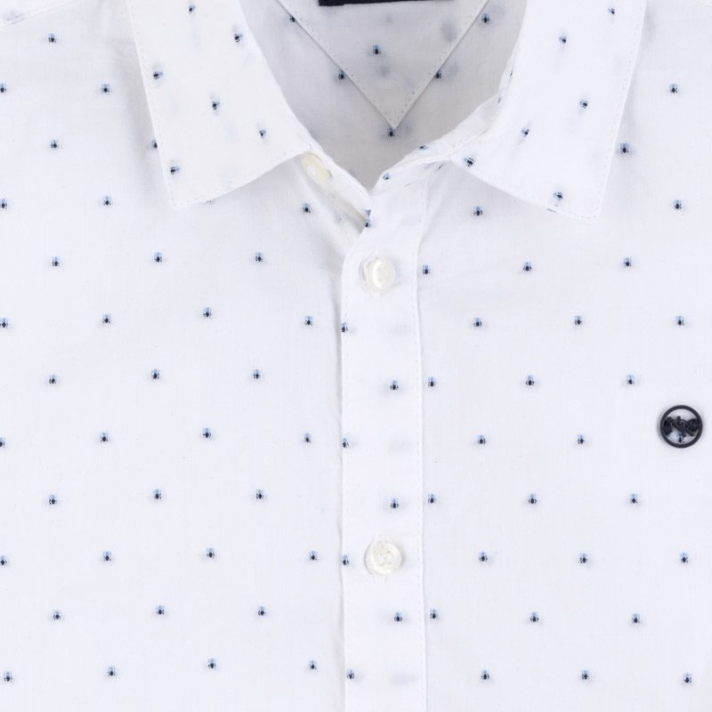 Chlapčenská košeľa s dlhým rukávom. Jemné vyšité tmavomodré bodky. Zapínanie na gombíky. Vyrobené zo 100% bavlny.