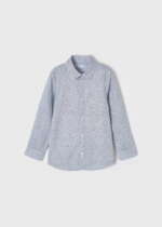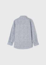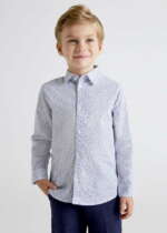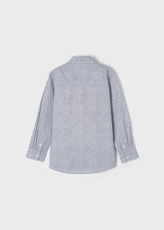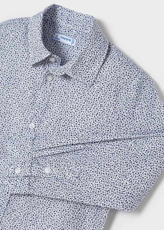Elegantná chlapčenská košeľa s jemným vzorom kvetín tmavomodrej farby. Biela košeľa s jemnou tmavomodrou potlačou kvietkov. Vyrobená zo 100% bavlny.