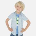 Chlapčenská košeľa s krátkym rukávom. Je vyrobená z kvalitnej 100% bavlny. Košeľu zdobí jemný motív tenisiek. Veľmi štýlová košeľa.