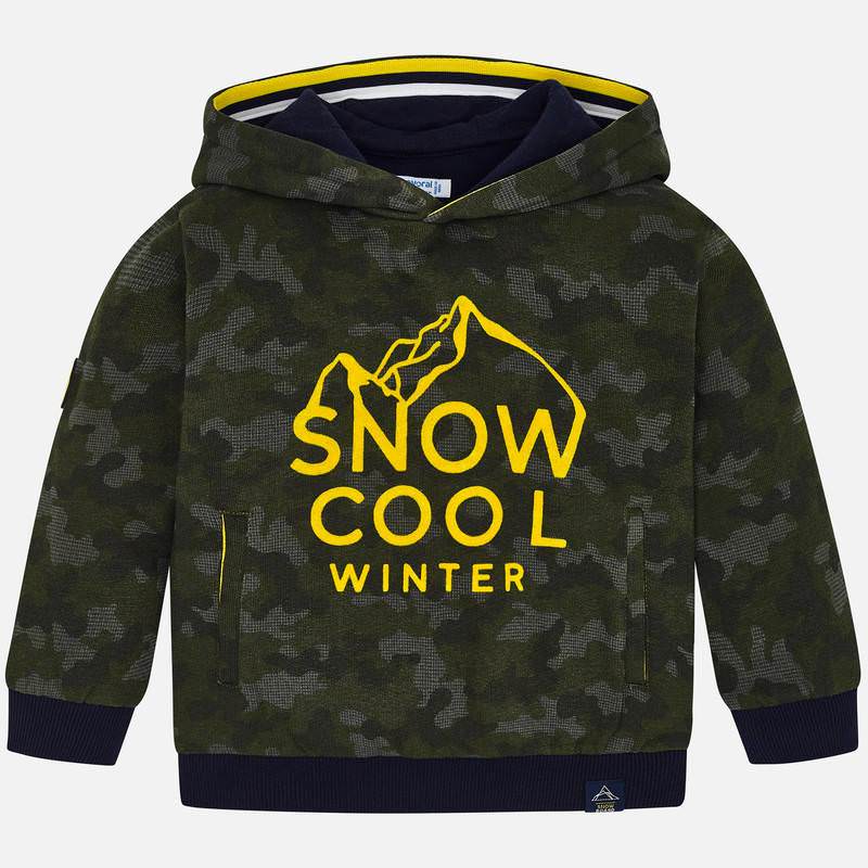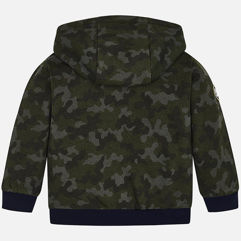 Maskáčová mikina s kapucňou pre chlapcov. Teplejší materiál. S patentami na spodku mikiny aj na rukávoch. Kapucňa nie je odopínateľná. Zvnútra je olemovaná žltým, modrým a bielym prúžkom.