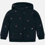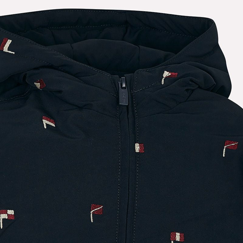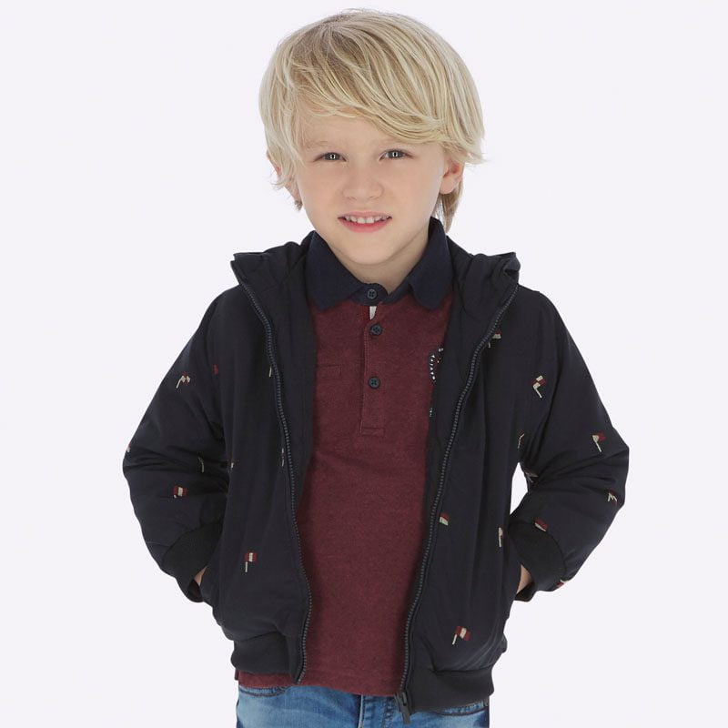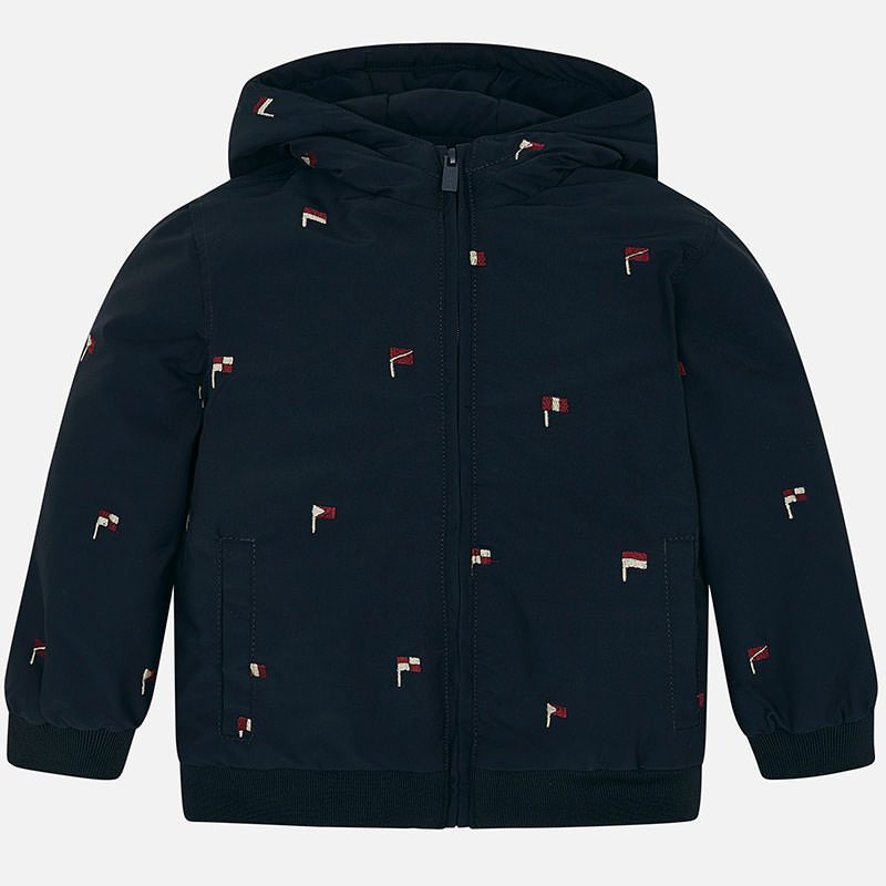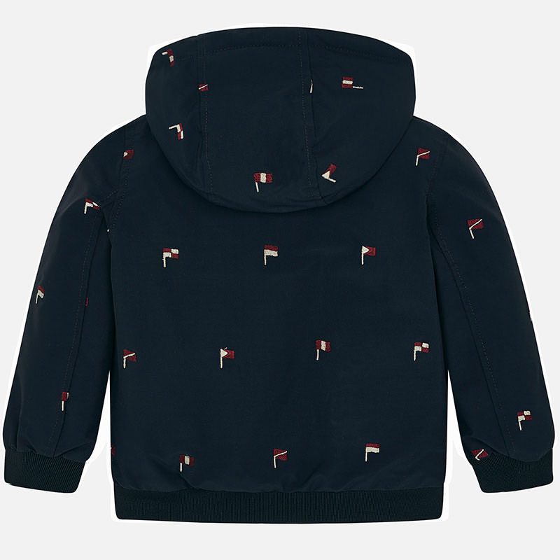 Chlapčenská prechodná bunda s kapucňou a s vlajkami Mayoral tmavomodrá