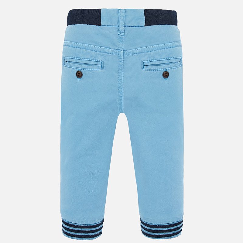 Nohavice pre chlapca na cvok, sčasti na gumu a na sťahovacie šnúrky. V spodnej časti patenty. Športový vzhľad. Elastický pás s nastaviteľnou šnúrkou. Predné a zadné funkčné vrecká. Bledomodrá farba. Veľmi jemné na dotyk, vyrobené z bavlny.