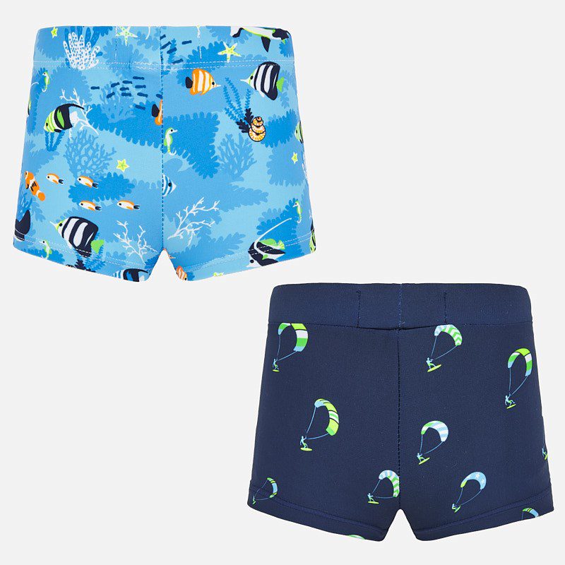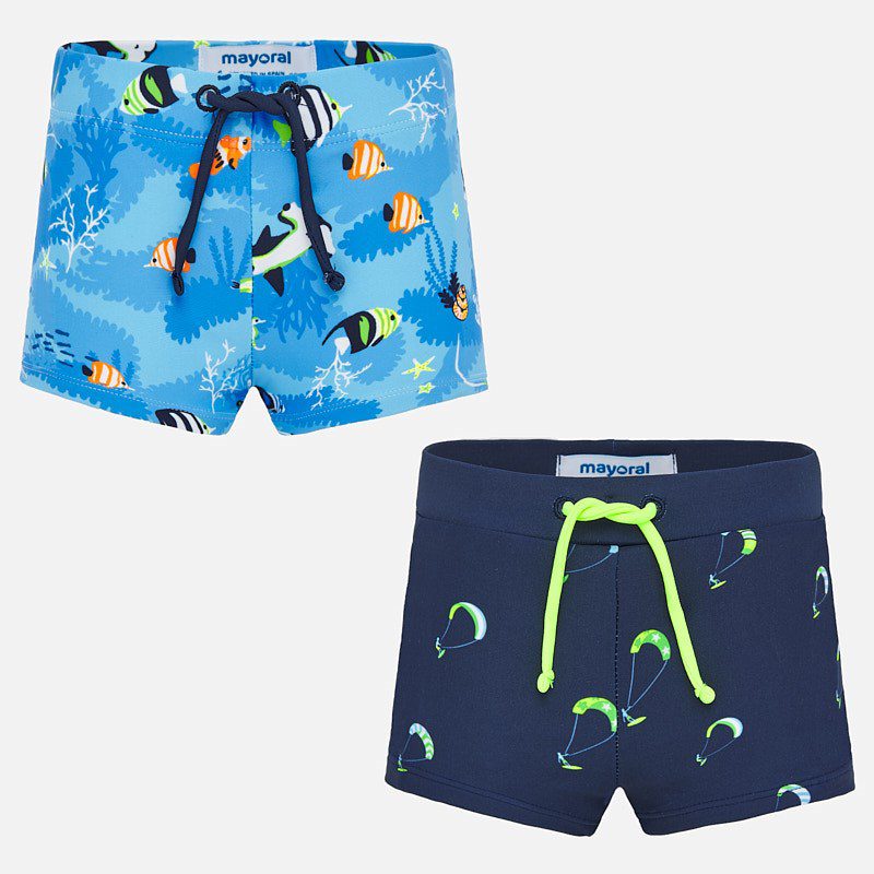 Set dvoch šortiek na kúpanie pre chlapcov. Svieži dizajn. Potlač rybičky a padáky. Vyrobené z elastickej textílie pre maximálne pohodlie.