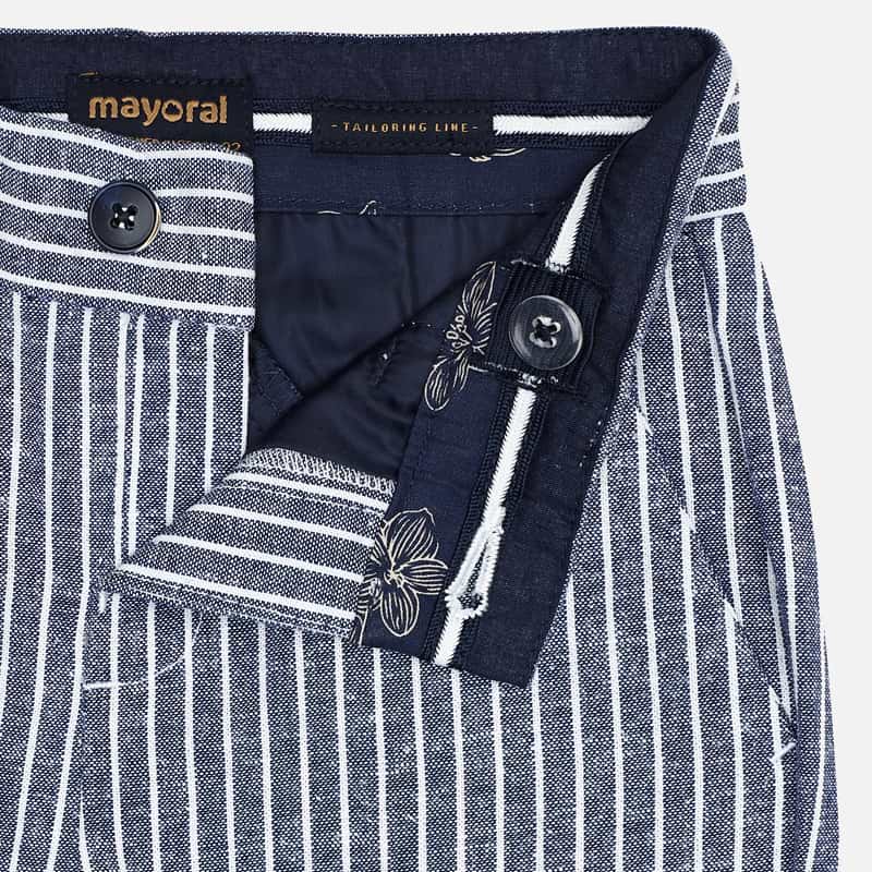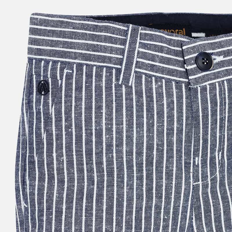 Kraťasy z jemnej bavlny a ľanu. Pruhované. Zapínanie na gombík. Nastaviteľný pás.