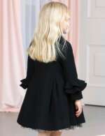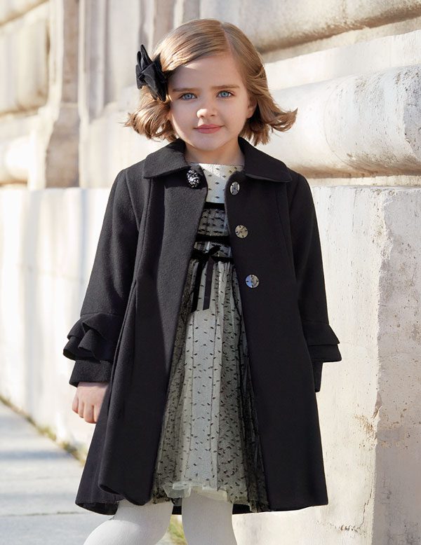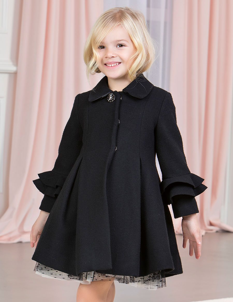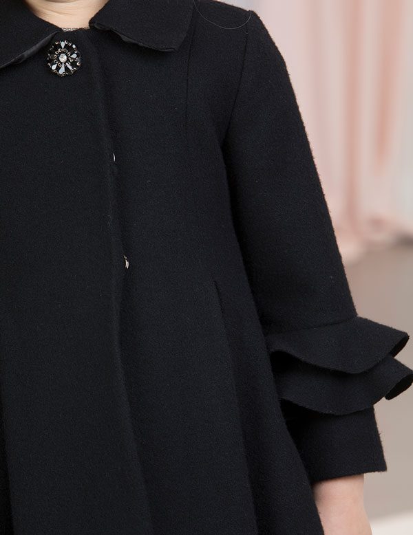 Dievčenský sofistikovaný čierny vlnený kabát. Elegantný kabát s brošňou. Volány na rukávoch. Zapínanie na 3 veľké cvoky.