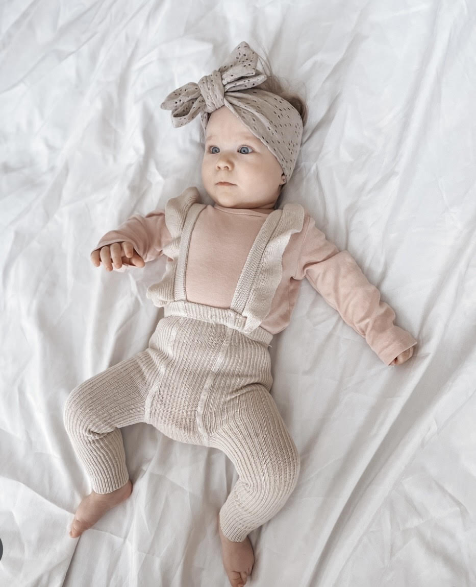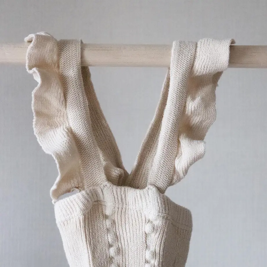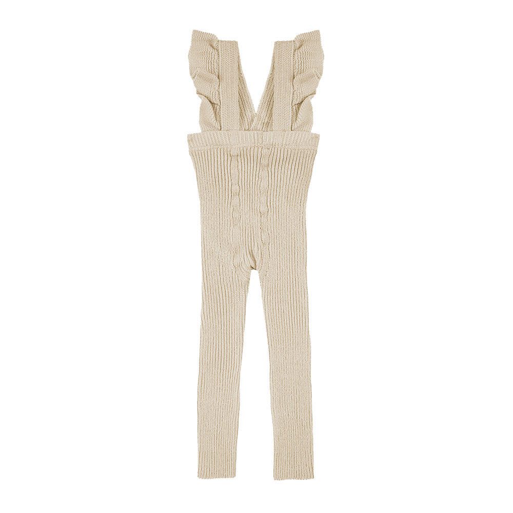 Béžové dievčenské pančuchy s volánovými trakmi, ktoré sú bez nožičiek. Teplé legíny s trami, ktoré majú nariasené volány.