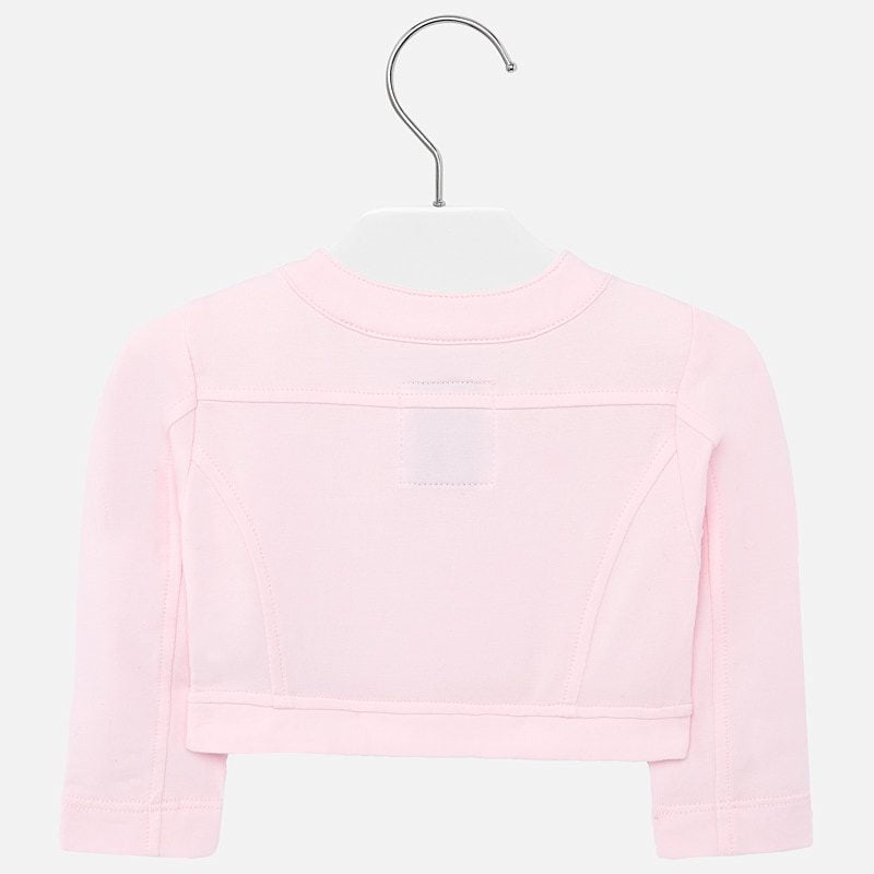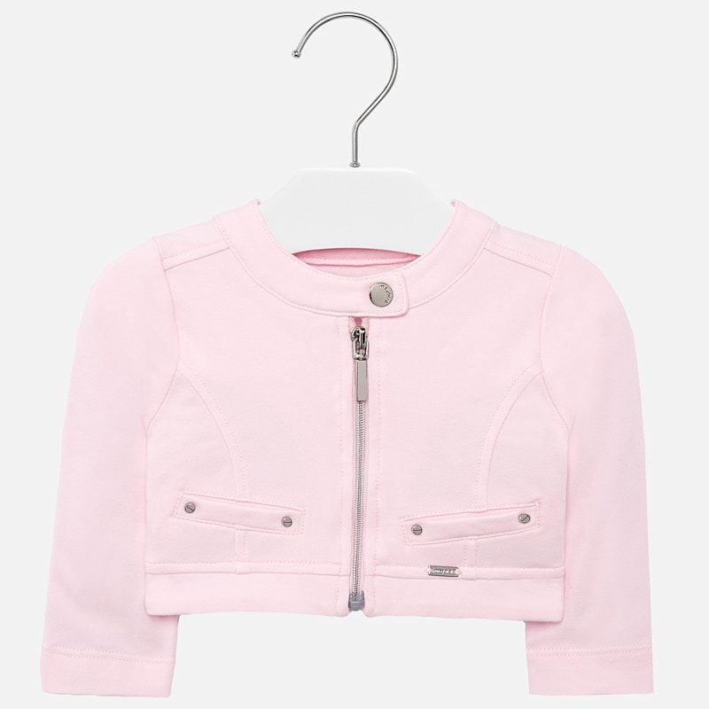 Langarm Baby Mädchen Blazer. Kragen mit Druckknopf. Mittiger Reißverschluss auf der Vorderseite. Bequemer Sweat-Stoff mit einem angenehmen und weichen Touch. Dekorative Blindtaschen vorne. Einfarbiges Design.