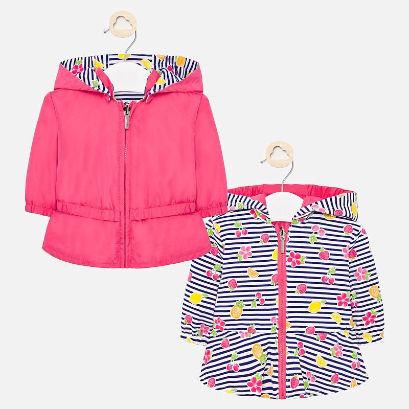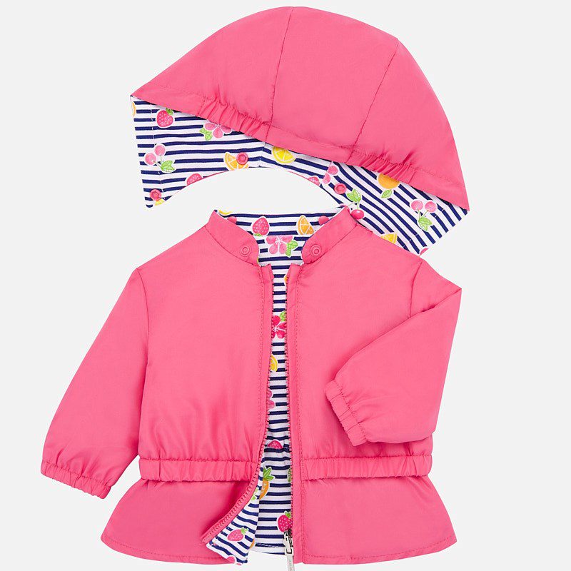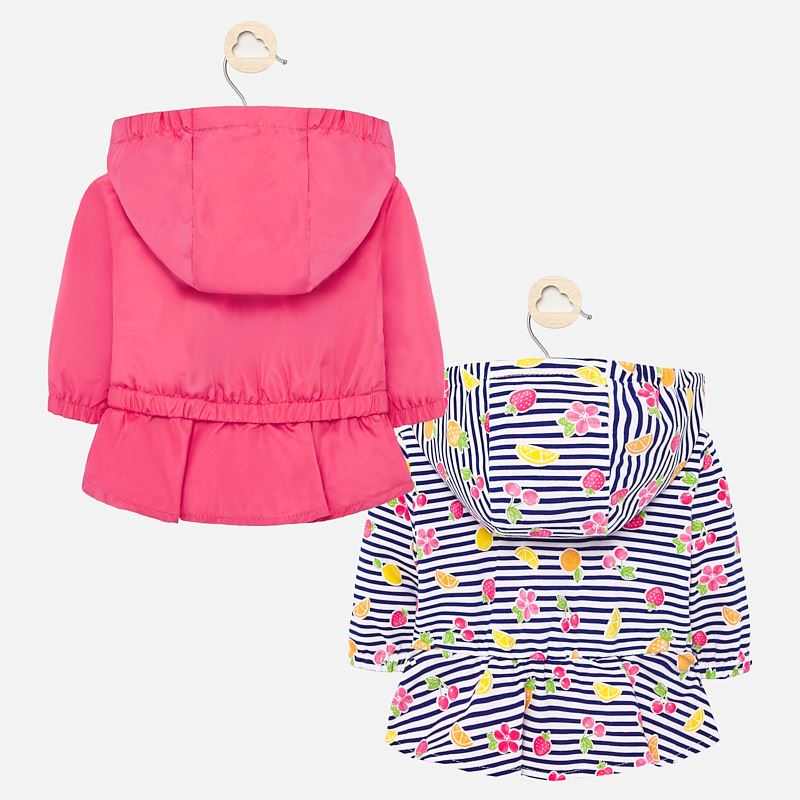 Long sleeved windbreaker jacket with elasticated cuffs for newborn girl. Round neckline. Detachable hood. Front, central zip fastening. Made from lightweight, breathable fabric which is comfortable to wear. Design with a decorative ruffle at the bottom of the item. This is a reversible item.