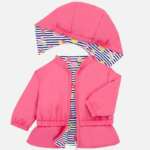 Bunda alebo tenká vetrovka s dlhými rukávmi a elastickými manžetami pre novorodenca. Okrúhly výstrih. Odnímateľná kapucňa. Predné stredné zapínanie na zips. Vyrobené z ľahkej priedušnej látky, ktorá sa pohodlne nosí. Dizajn s ozdobným volánom v spodnej časti bundy. Obojstranná bunda. Bunda vhodná na jar, leto. Materiál: 100% polyester, zvnútra: 95% bavlna, 5% elastan.
