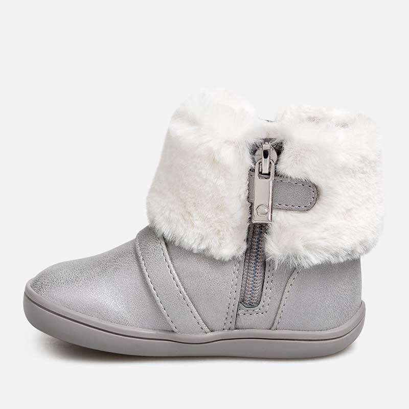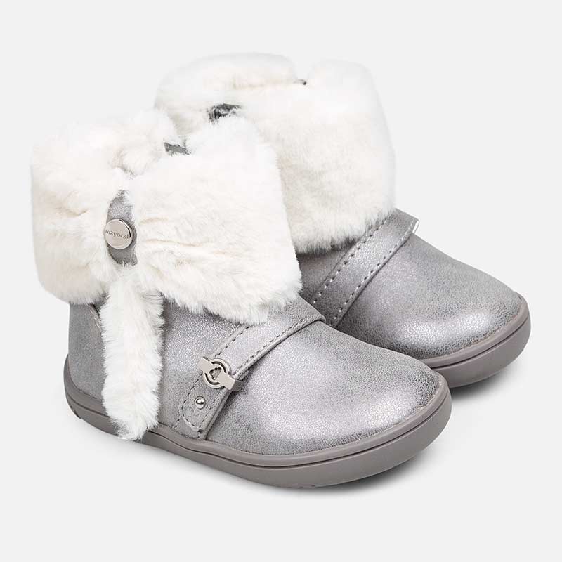 Strieborné kožené čižmy Mayoral pre dievčatká. Zapínajú sa na zips. Kožušina je aj z vnútornej aj z vonkajšej strany. Na boku majú kovovú značku a malú mašľu.