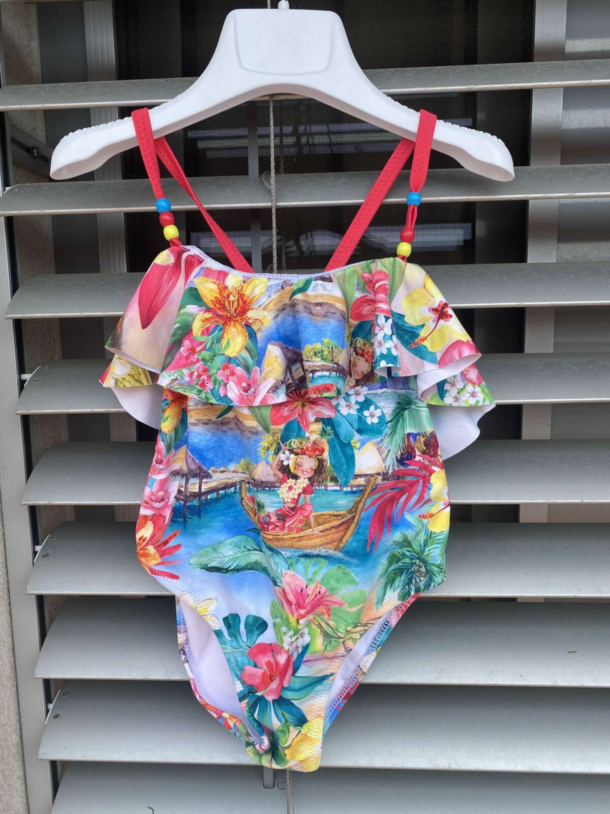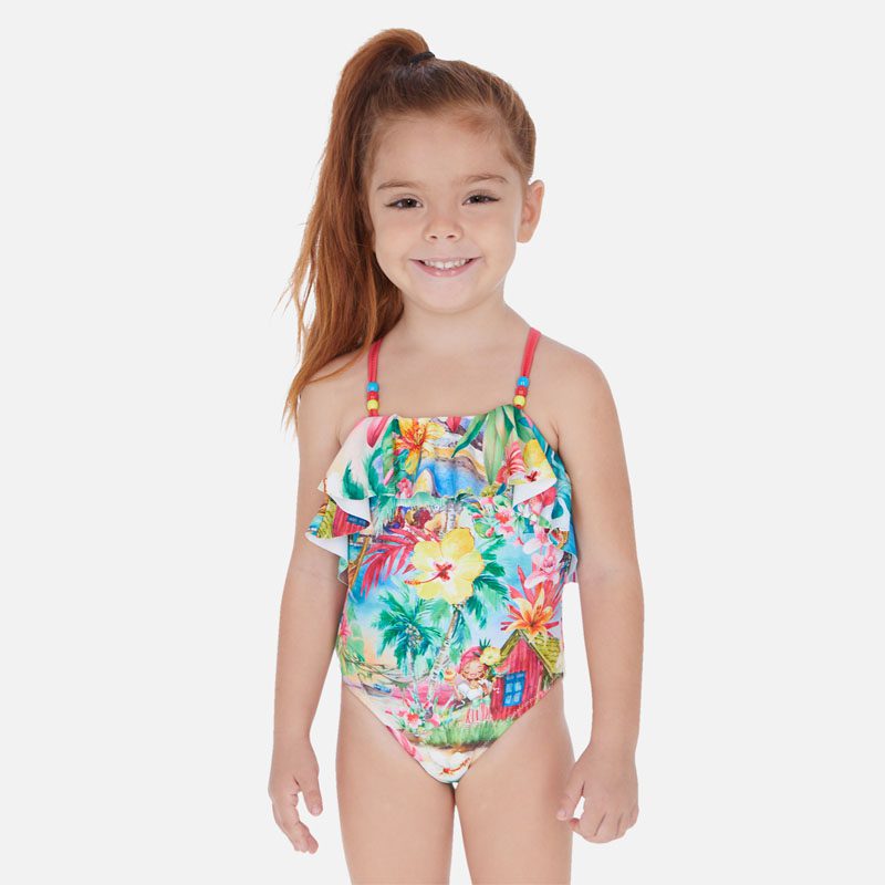 Patterned swimsuit for girl. Crossed back swimsuit with adjustable strap for girl. Made using elasticated fabric for maximum comfort on a day to day basis. Decorative elements: decorative ruffles. Summer print.