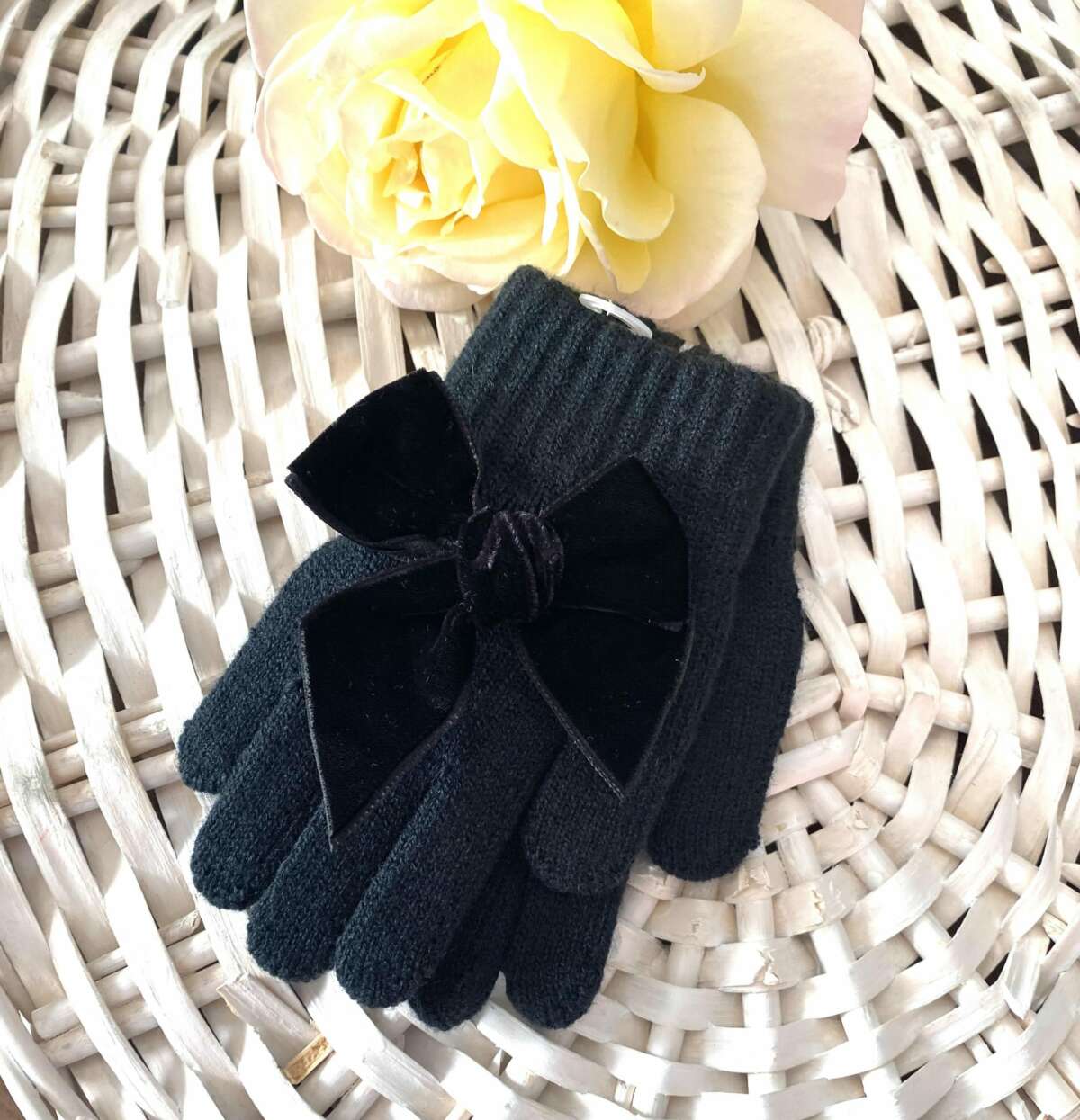 Dievčenské štýlové čierne rukavice. Vyrobené z kvalitného materiálu, zdobené veľkou velvet mašľou. Na 10 rokov sadnú dospelému človeku. Materiál: 94% akryl, 1% elastan, 5% nylon.