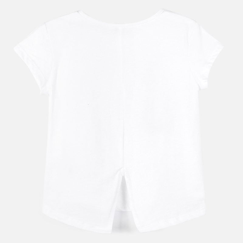 Short sleeved t-shirt for girl. Round neckline. Made from soft elasticated cotton fabric. Opening on the back part of the bottom to facilitate movement. Decorative elements: design on the front, glitter, studs.