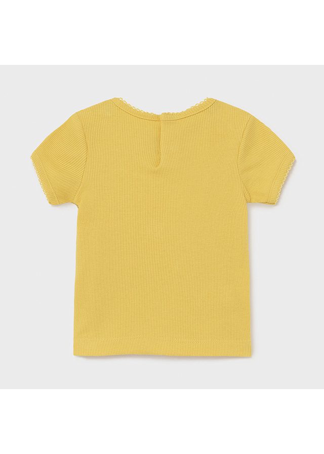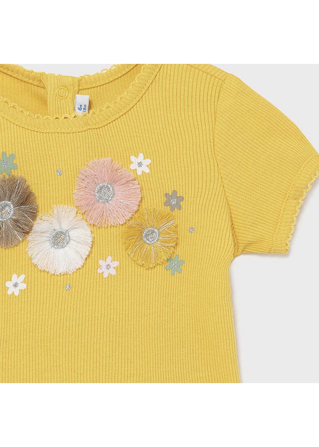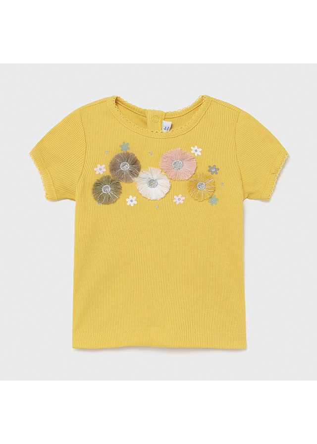 Dievčenské vrúbkované tričko s krátkym rukávom a 3D kvetmi Mayoral žlté