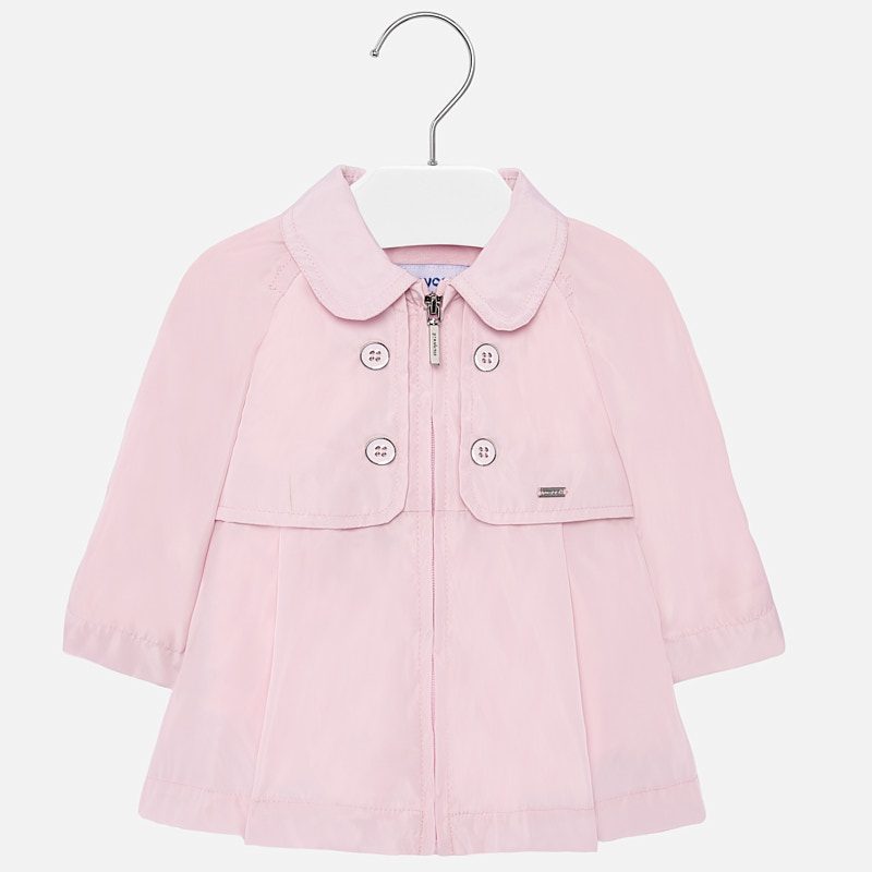 Long sleeved jacket for baby girl. Lapel collar. Fitted to the waist. Zip and buttons to fasten. Made with lightweight, breathable fabric which is comfortable to wear. Opening on the bottom part of the item at the back. Plain design.