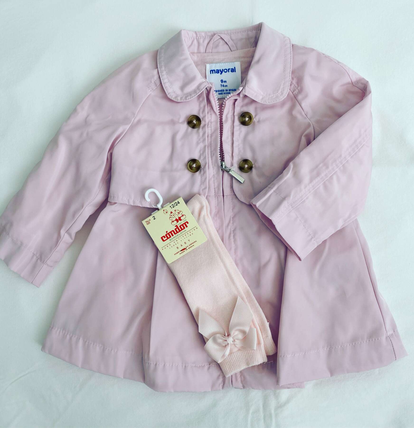 Predĺžený kabátik pre bábätká. Chlopňový golier. Zapínanie na zips. Vyrobené z ľahkej priedušnej látky, ktorá sa príjemne nosí. Kabát má jednoduchý dizajn. Skombinujte s podkolienkami z našej ponuky.