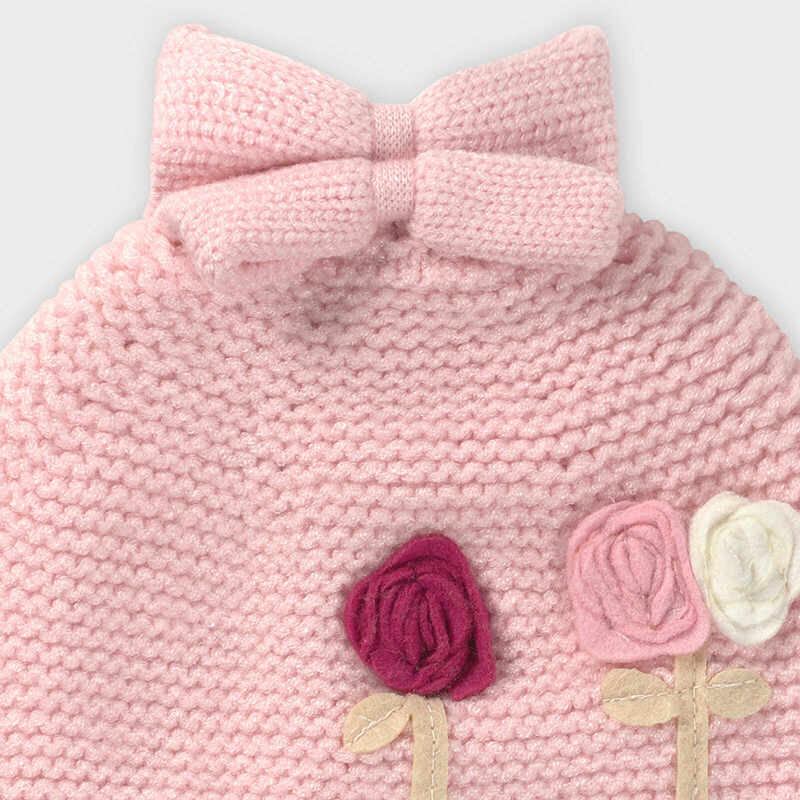 Three piece set for baby girl. Knitted scarf for baby girl, perfect for protecting their neck when the temperatures drop. A fundamental accessory in their winter wardrobe. Elastic, flowing fabric for maximum comfort on a day to day basis. Decorative elements: floral appliques. Hat for baby girl made from warm, flexible materials which guarantees a perfect fit and maximum comfort to protect them from the cold. Elastic, flowing fabric for maximum comfort on a day to day basis. Decorative elements: floral appliques. Pair of gloves for baby girl, ideal to protect their hands on those colder days. Elastic, flowing fabric for maximum comfort on a day to day basis.