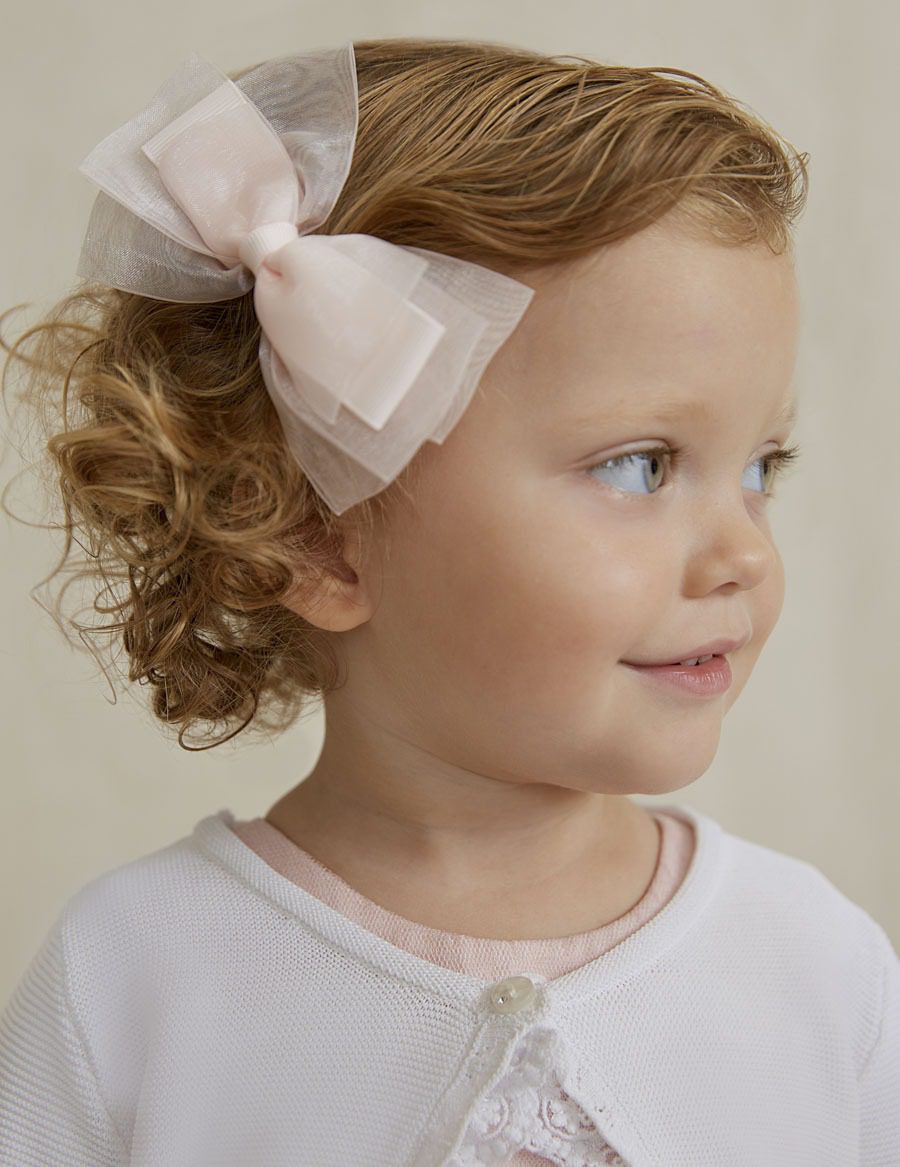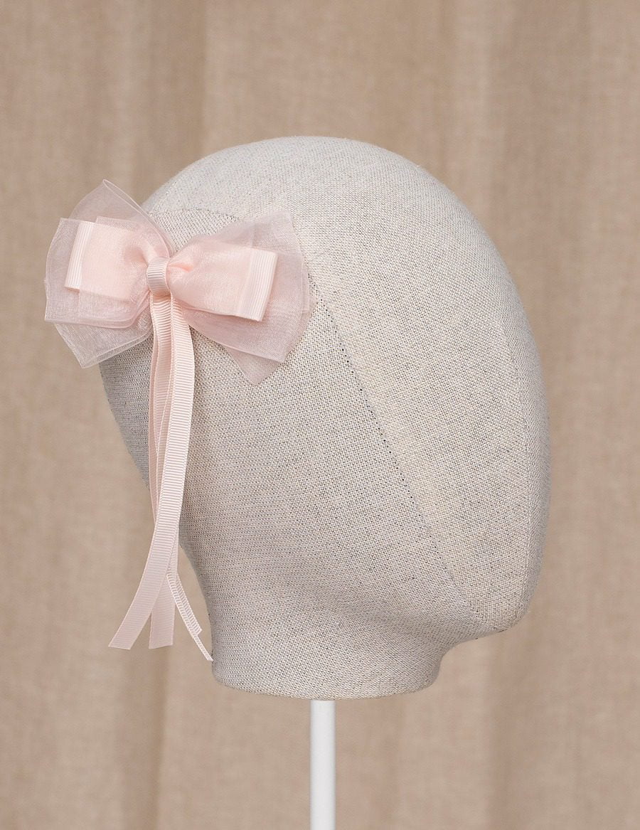 Dvojitá mašlička s padajúcim strapcom v jemne ružovej farbe. Materiál: 100% polyester.