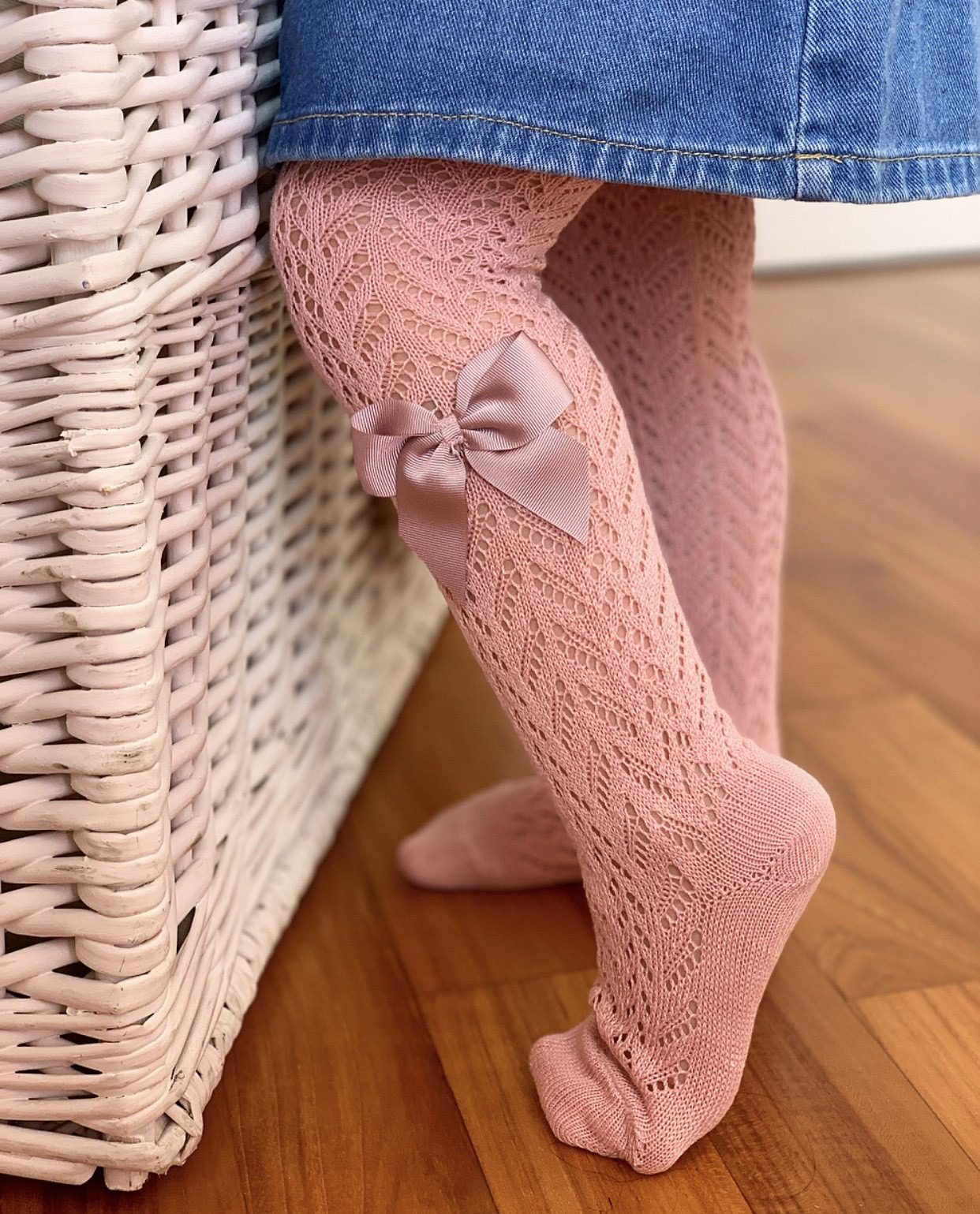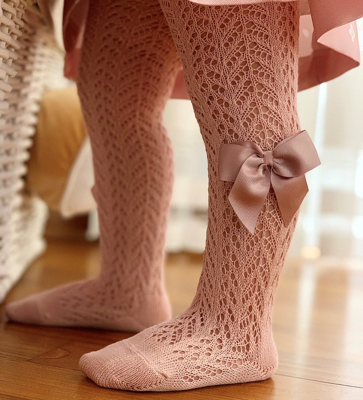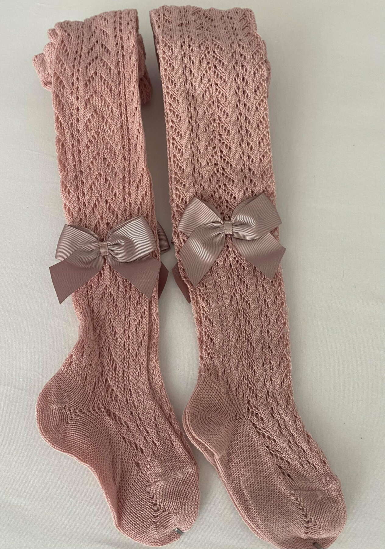 Všetky predsa milujeme mašličky na detskom oblečení. Tieto háčkované pančuchy so saténovou mašľou sú kvalitné, prepracované a mašlička pekne drží tvar. Pančuchy sú vhodné na jar a leto. Vyrobené sú z perleťových nití v Španielsku.
