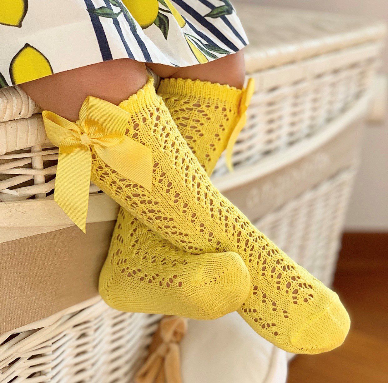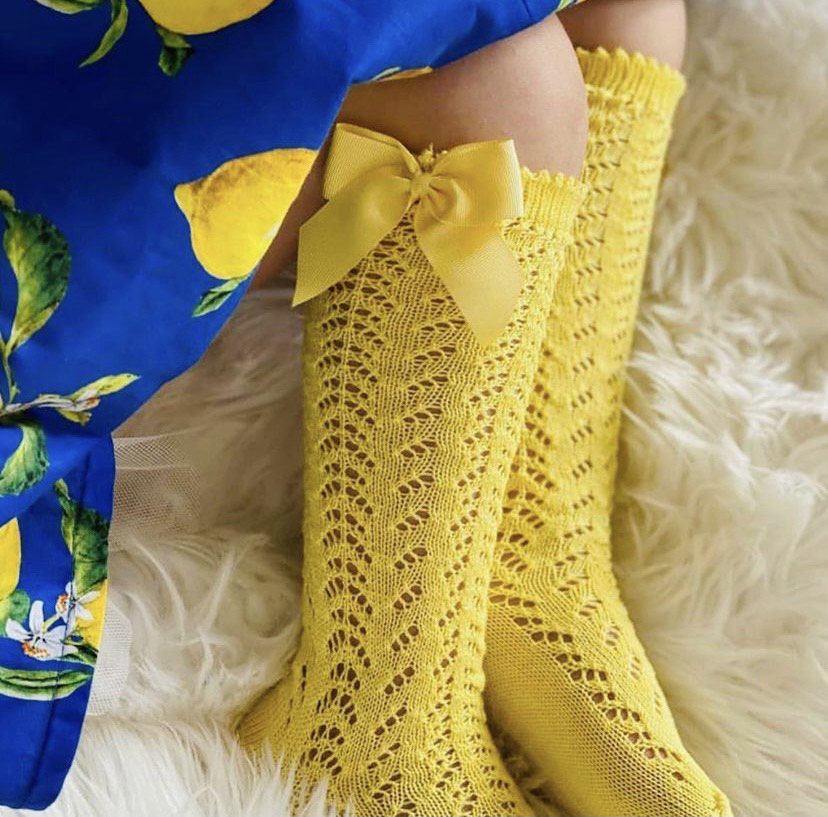 Žlté háčkované podkolienky so saténovou mašľou. Podkolienky krásne vyniknú k šatám. Dokončite outfit vášho dievčatka týmito vzorovanými podkolienkami.