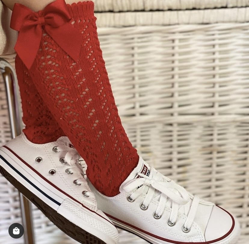 Červené háčkované podkolienky so saténovou mašľou, ktorá drží tvar. Podkolienky vyrobené z perleťových nití a zo 100% bavlny v Španielsku. Stačí obuť tenisky, baleríny či retro topánky a perfektný outfit je na svete. Farba je pekná svetlá červená. Nejde dooranžova.