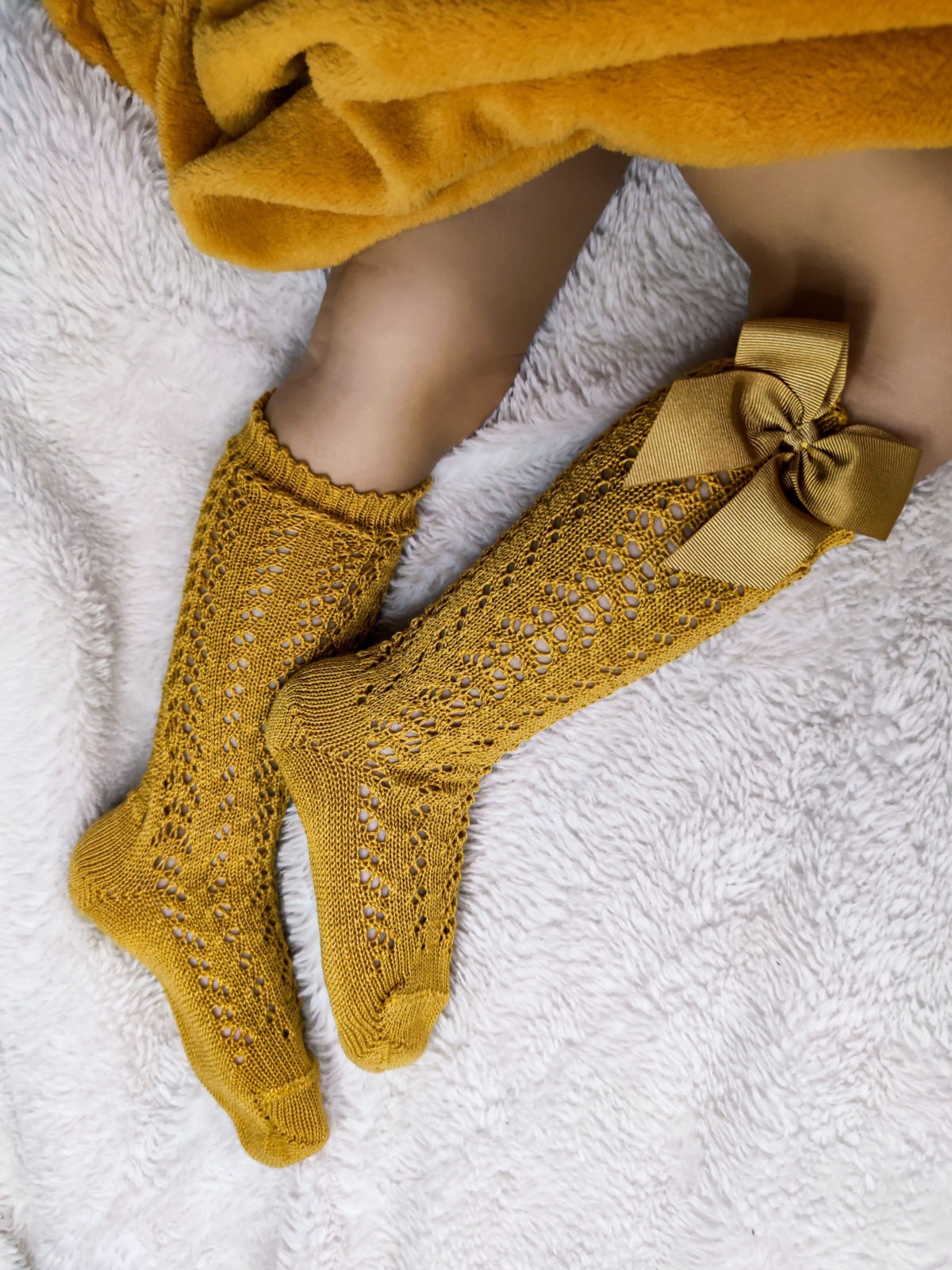 Háčkované podkolienky so saténovou mašľou Cóndor horčicové