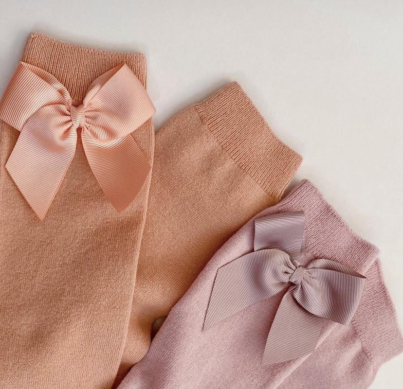 Broskyňové podkolienky so saténovou mašľou na dokončenie outfitu.