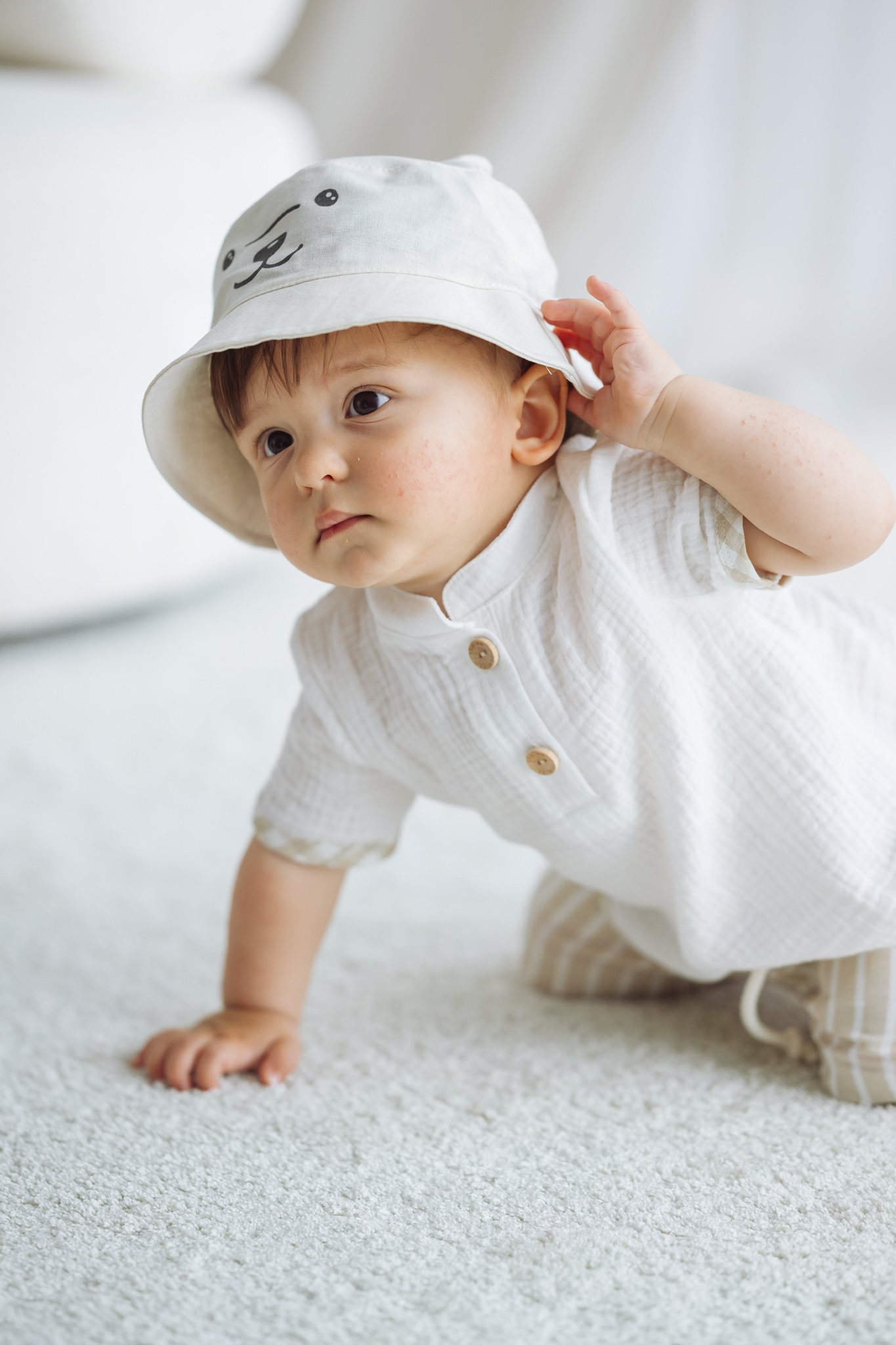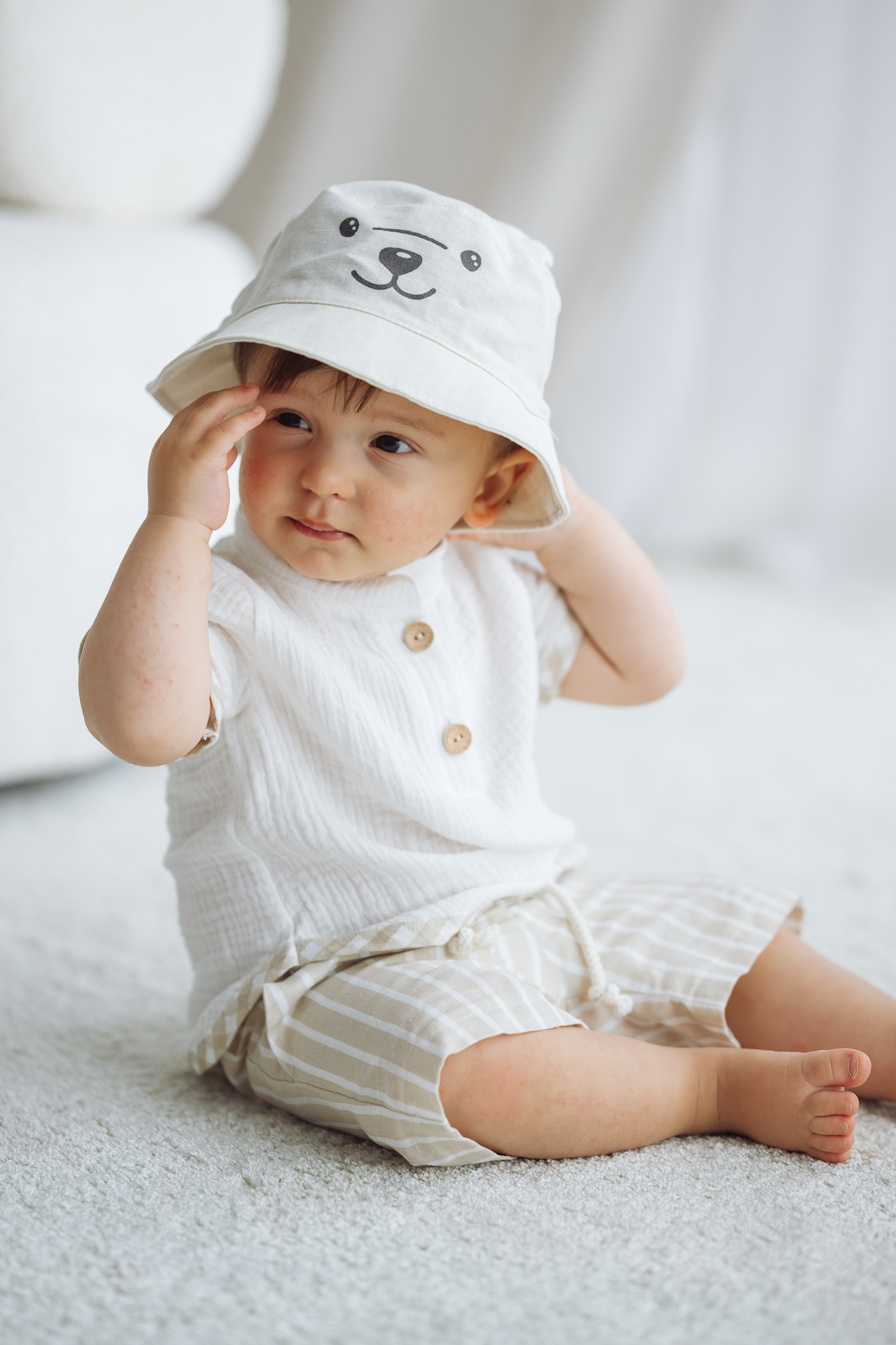 Hľadáte dokonalú ochranu pred slnkom, ktorá vyčarí úsmev na tvári? Náš béžový klobúčik s roztomilými uškami je povinnou výbavou pre každého malého dobrodruha. Vďaka neutrálnej pieskovo-béžovej farbe sa hodí ku každému outfitu a je ideálny pre chlapcov aj dievčatá. Rozkošné ušká a detailná tvár macka urobia z nosenia klobúka zábavu, nie povinnosť. Široký lem chráni citlivé detské oči a tvár pred priamym slnečným žiarením. Skvelý na pieskovisko, rodinnú dovolenku pri mori alebo letnú prechádzku parkom. Materiál: 55% ľan, 45% bavlna.