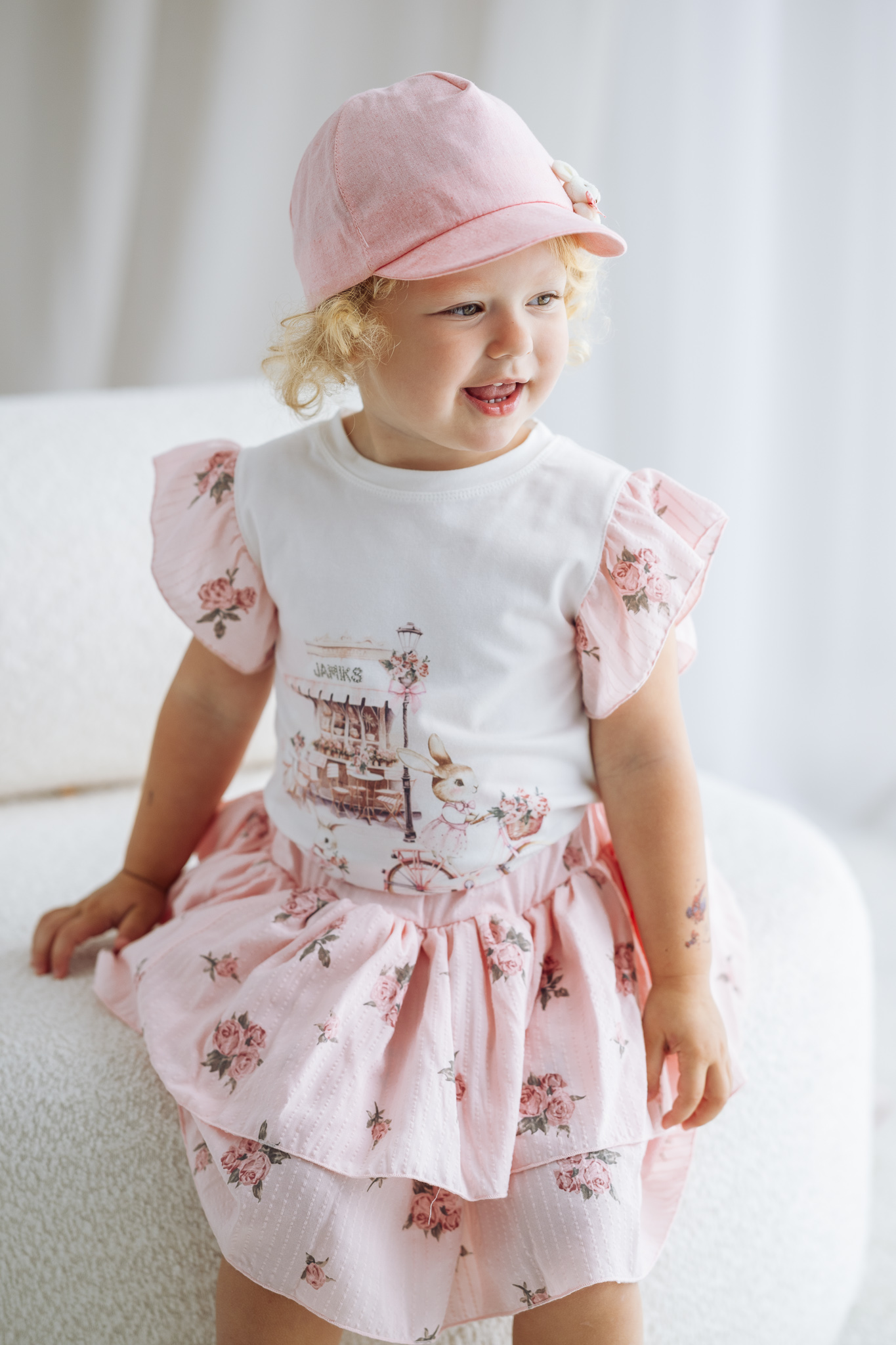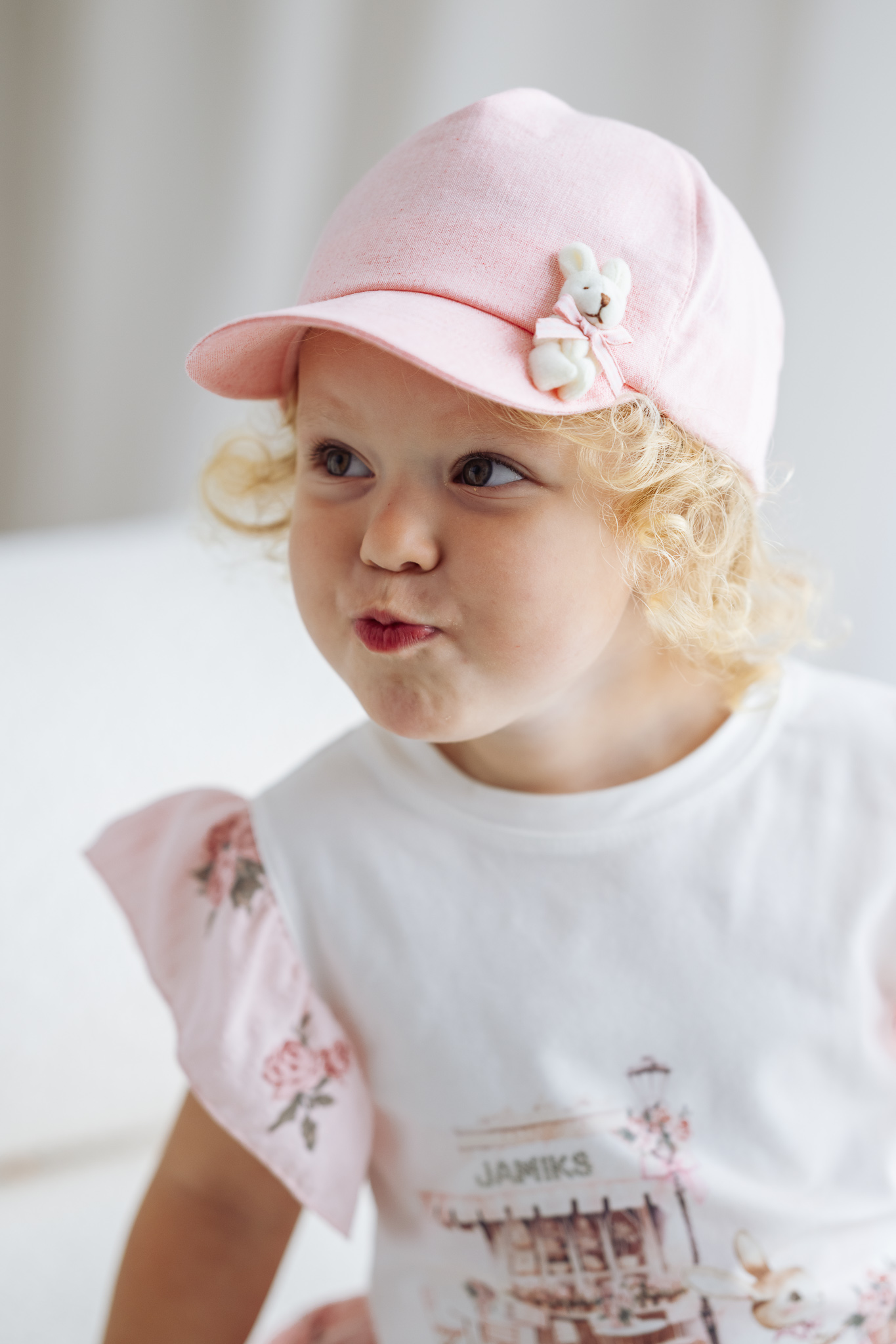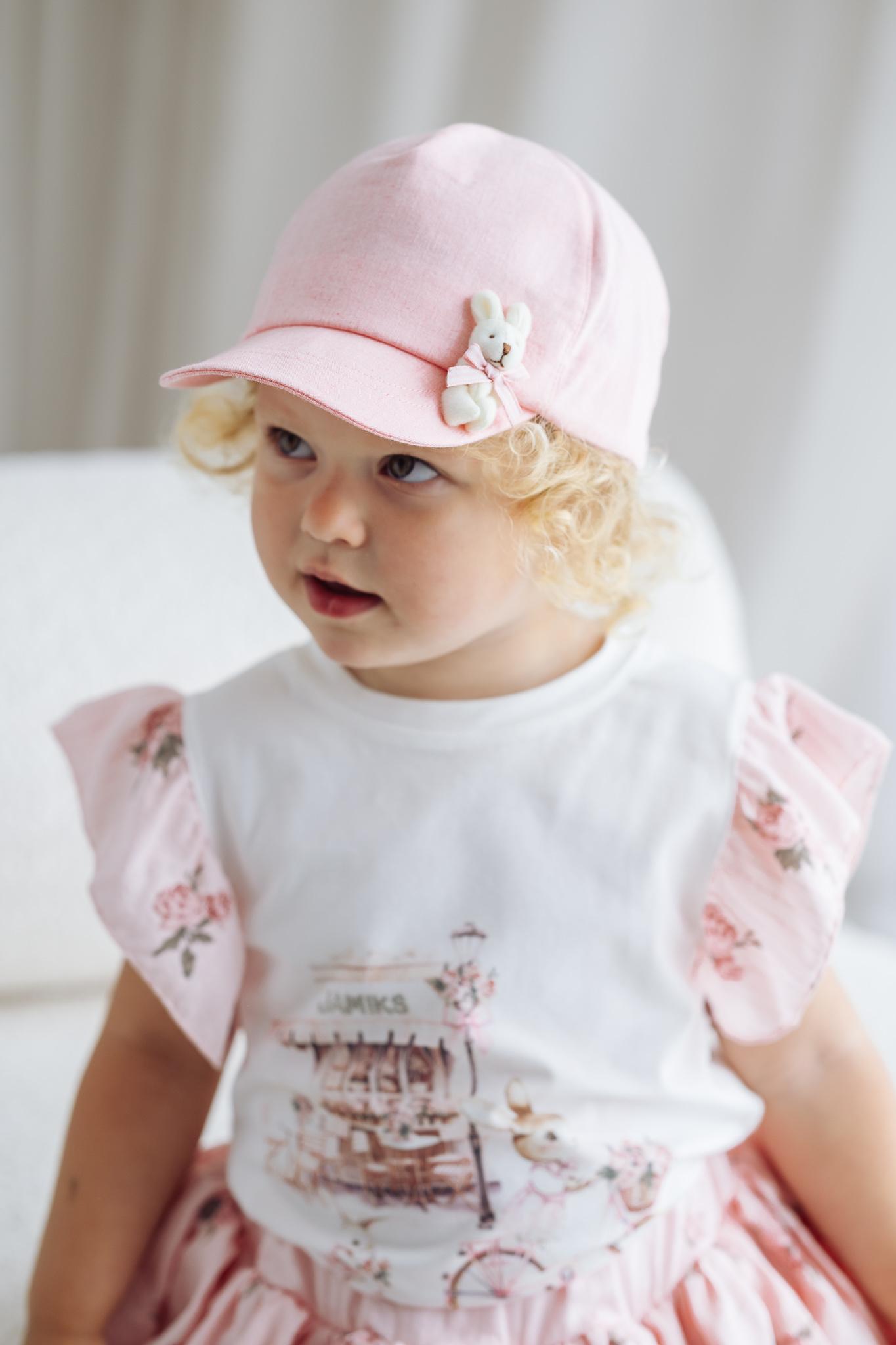 Doprajte vašej malej parádnici štýlovú ochranu pred slnkom! Táto detská šiltovka v nádhernom odtieni ružovej je stvorená pre tie najteplejšie letné dni. Šiltovka je vyrobená z tenkej a priedušnej tkaniny, ktorá zabezpečí komfort aj počas horúčav a nezaťažuje hlávku. Prednú stranu zdobí nežná aplikácia malého zajačika s roztomilou mašličkou, ktorú si každé dievčatko okamžite zamiluje. Vďaka svojej ľahkosti je skvelou spoločníčkou na pláž, ihrisko či rodinné výlety. Rozžiarte letné dobrodružstvá týmto praktickým a milým doplnkom! Materiál: 100% bavlna.