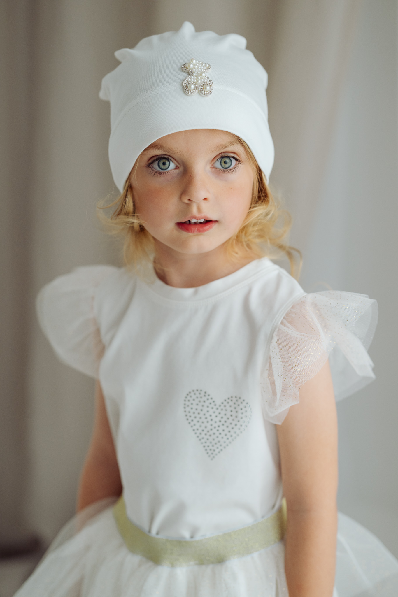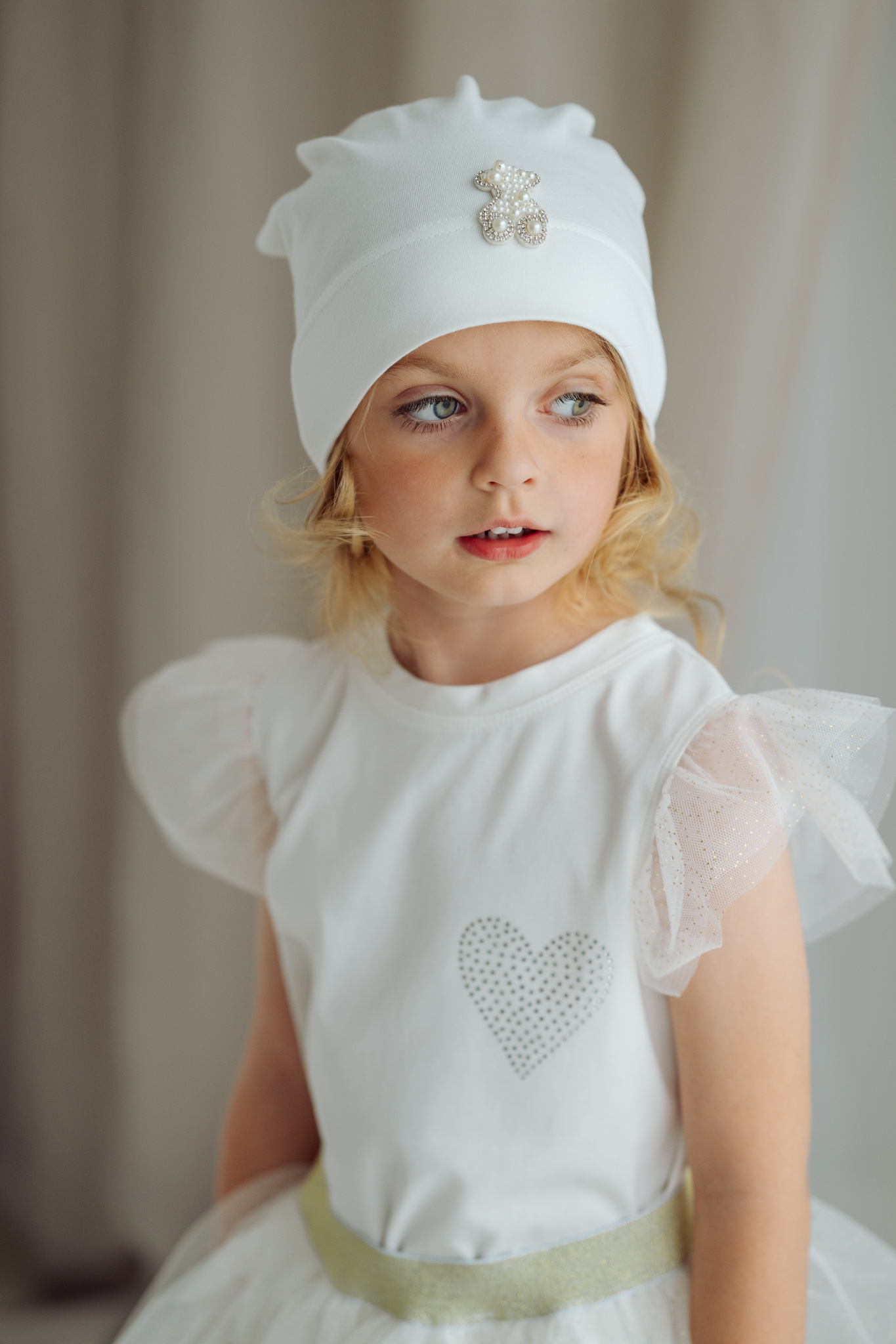 Oživte šatník vašej malej parádnice touto štýlovou čiapočkou v elegantnej bielej farbe. Je to dokonalý kúsok pre dievčatá, ktoré milujú jemné farby a hravé detaily v podobe obľúbených zvieratiek. Vyrobená z kvalitného ľahkého úpletu, ktorý je ideálny na prechodné obdobie alebo chladnejšie letné rána. Dominantou čiapky je drobná ozdoba v tvare macíka, ktorá dodáva celému outfitu jedinečný charakter a dievčenský šmrnc. Tento kúsok premení každú prechádzku na štýlovú udalosť. Doprajte svojej dcérke doplnok, v ktorom sa bude cítiť pohodlne a vyzerať úžasne. Materiál: 95% bavlna, 5% elastan.