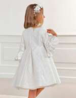 Jarný žakárový elegantný kabát pre dievčatá. Bodkovaný elegantný kabátik. Farba: biela. Rukávy: 3/4 rukávy s volánmi. Zapínanie je na cvoky. Strih: do Áčka, sukňový skladaný strih.