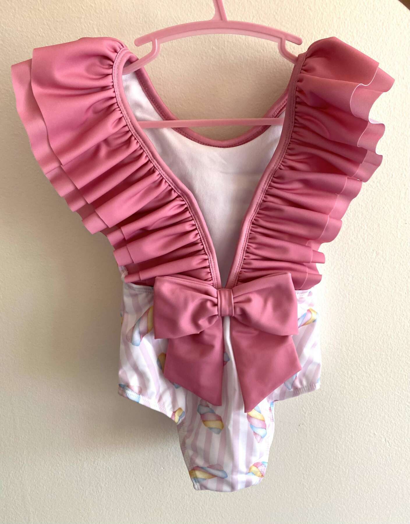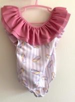 Jednodielne volánové plavky s veľkou mašľou na chrbáte. Kvalitné plavky, ktoré sa neroztiahnu.