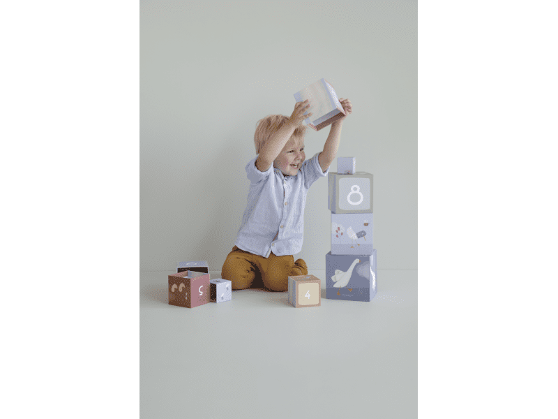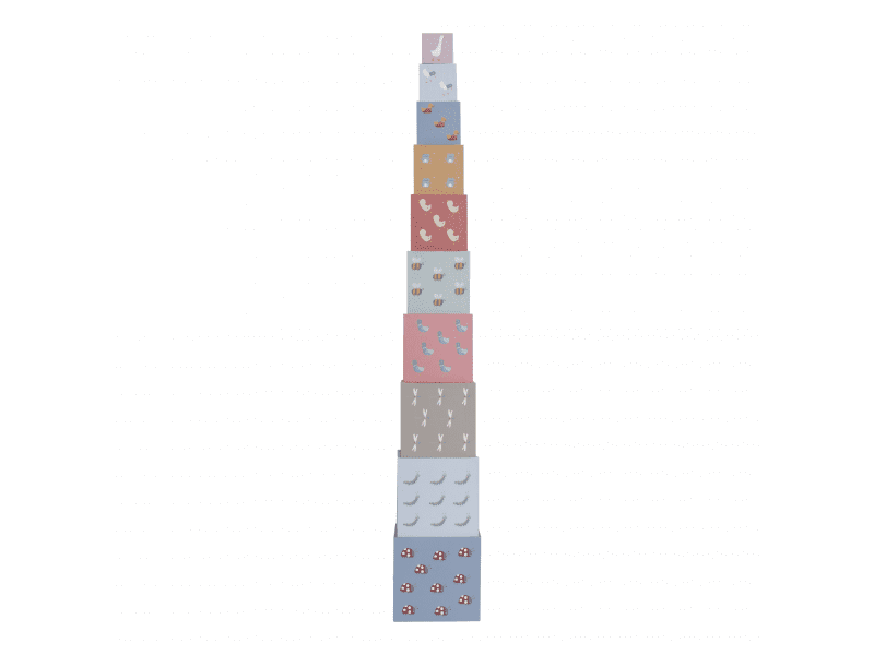These stacking blocks with animal print teach children how to do puzzles, stack and count up to 10. All sides of the stacking tower have different pictures and the prints match up nicely. The cubes are made of sturdy cardboard and are resistant to bumps. The smallest block is 5 cm and the largest block is 14 cm.