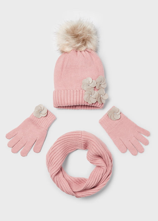 MAYORAL Čiapka, šál a rukavice s kvetom ružový Hat scarf set pink 10597