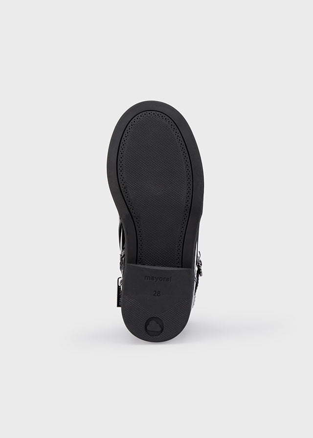 Čierne lakované nízke čižmy pre dievčatá. So zapínaním na zips. Materiál: 100% polyuretán, vnútro 56% bavlna, 44% koža. Podrážka: 100% termoplastická guma.