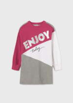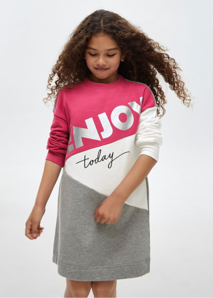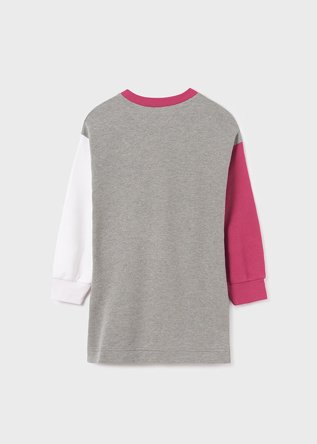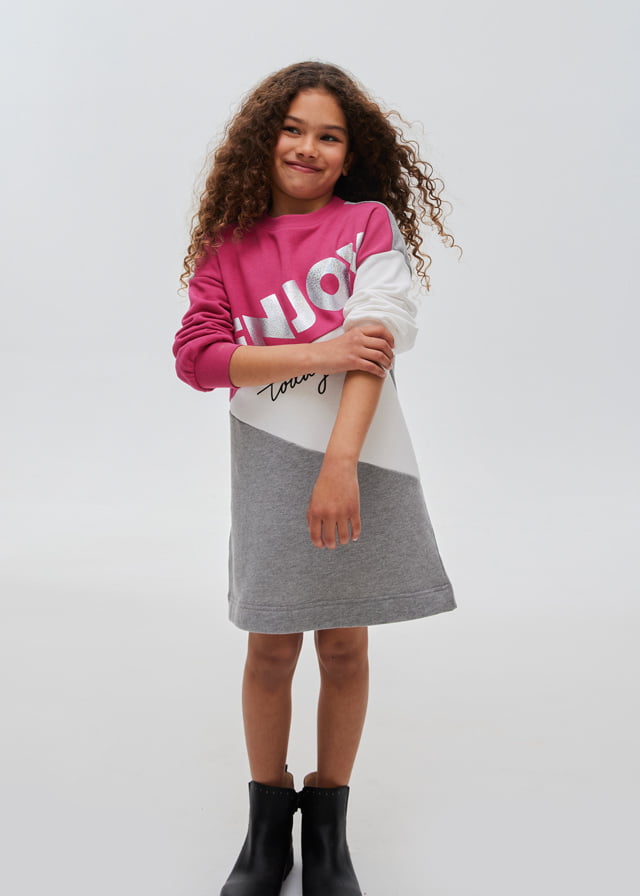 Long sleeved jumper dress with elasticated cuffs for girl. Round neckline. Three-colour design.