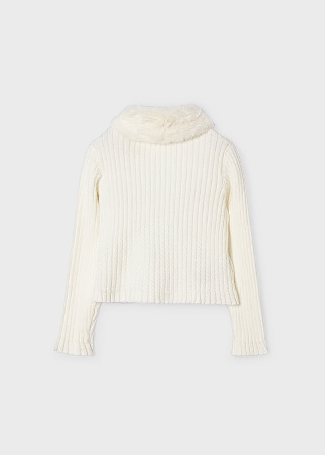 Dievčenský biely rebrovaný sveter na gombíky. Sveter má odopínateľný kožušinový golier.